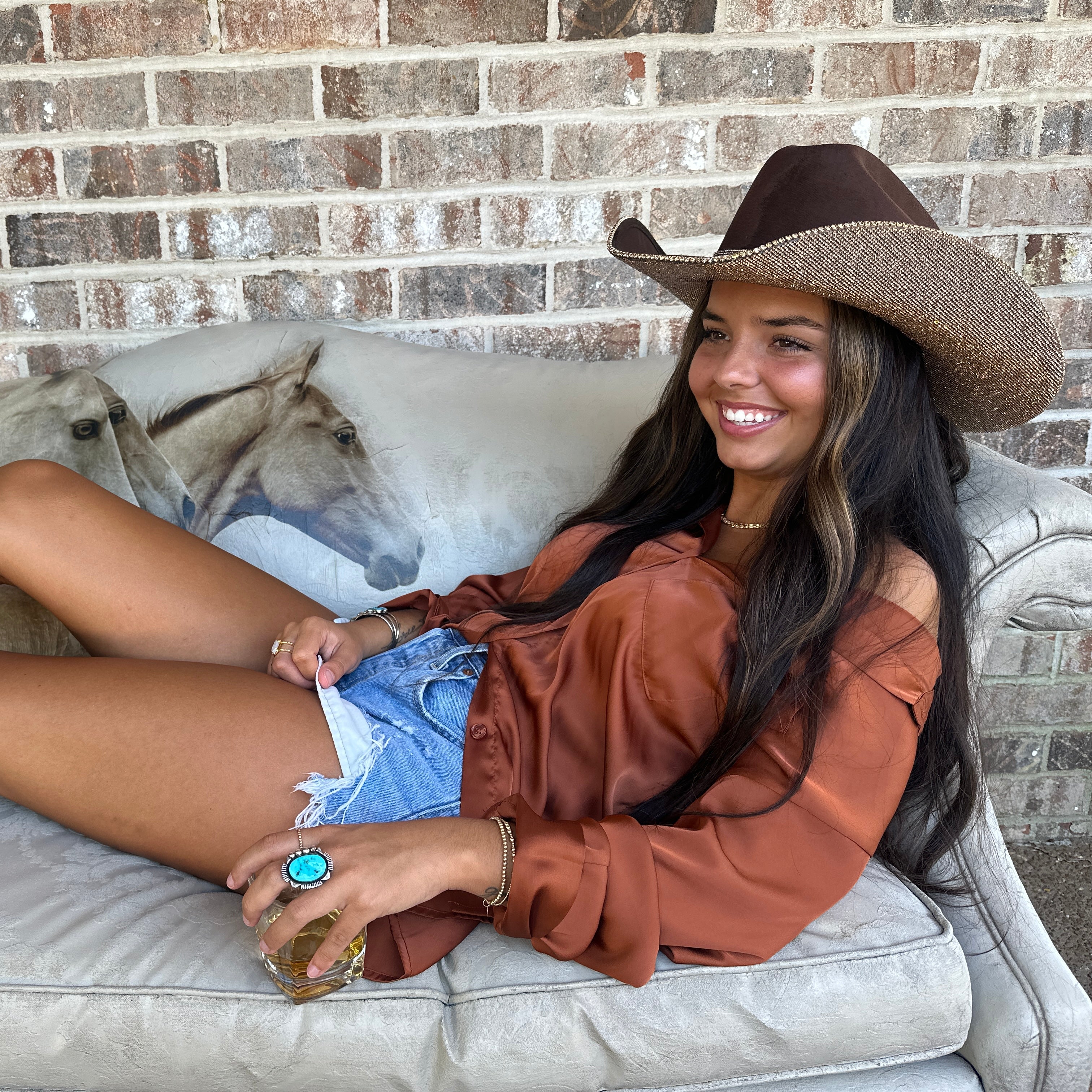 One of our new suede hats! These suede's are the newest trending item for the fall and winter season this year. Perfect for fall weddings, NFR, rodeo balls and more. You will absolutely make a statement in these hats and be the best dressed at your event!