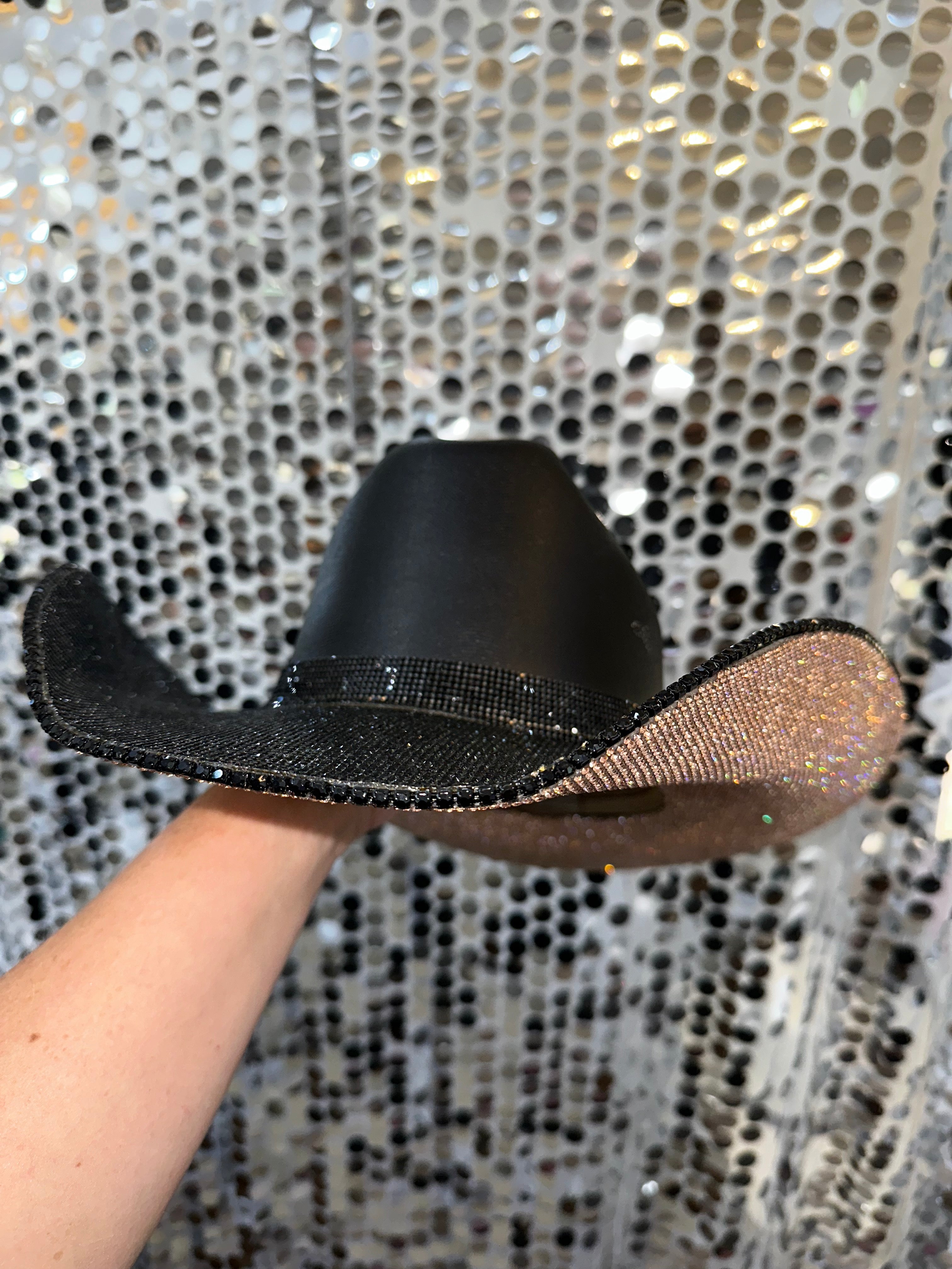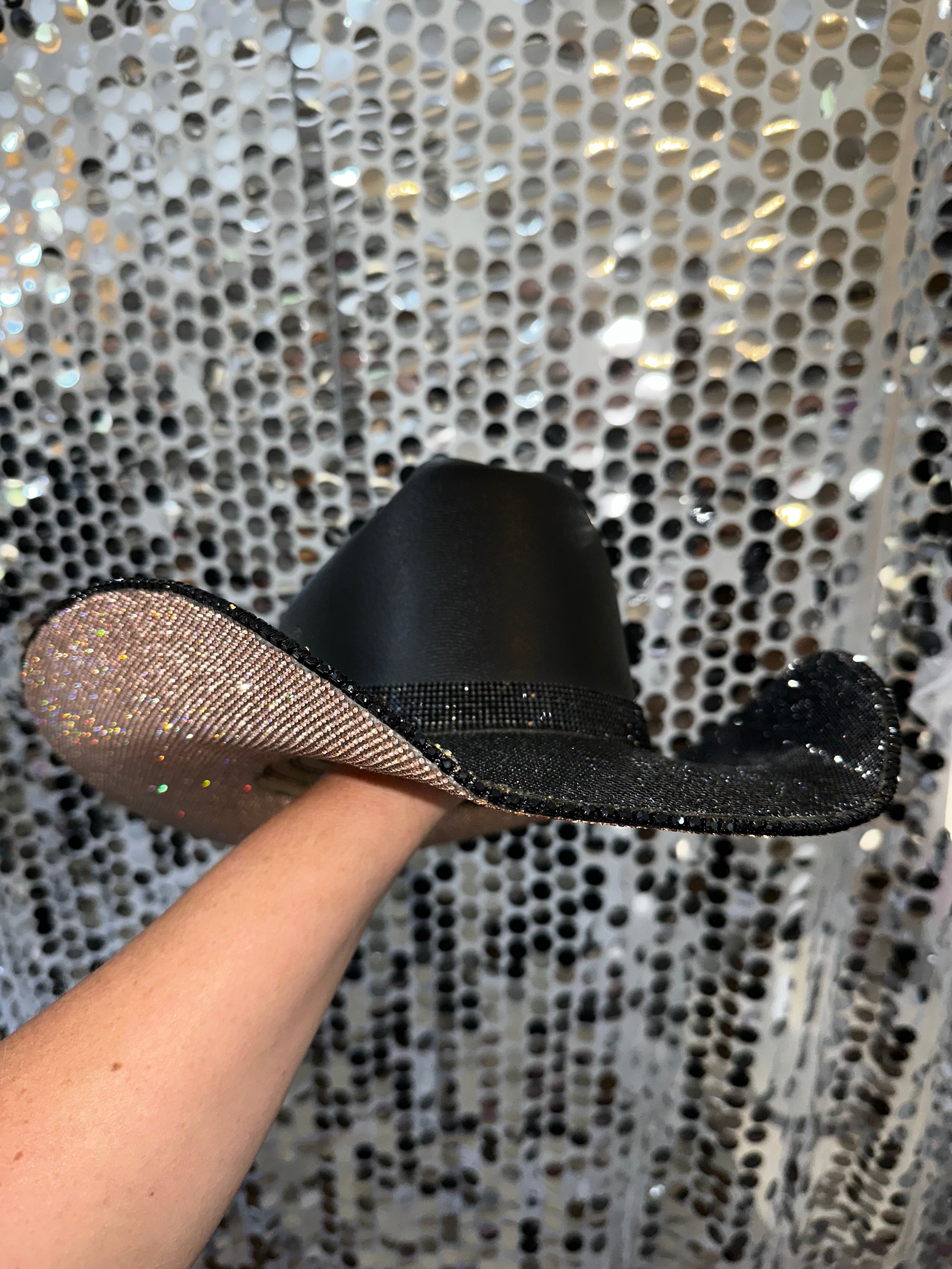Our black and champagne features our black square straw hat+ champagne rhinestones on the UNDERNEATH BRIM and black rhinestones on the top brim.