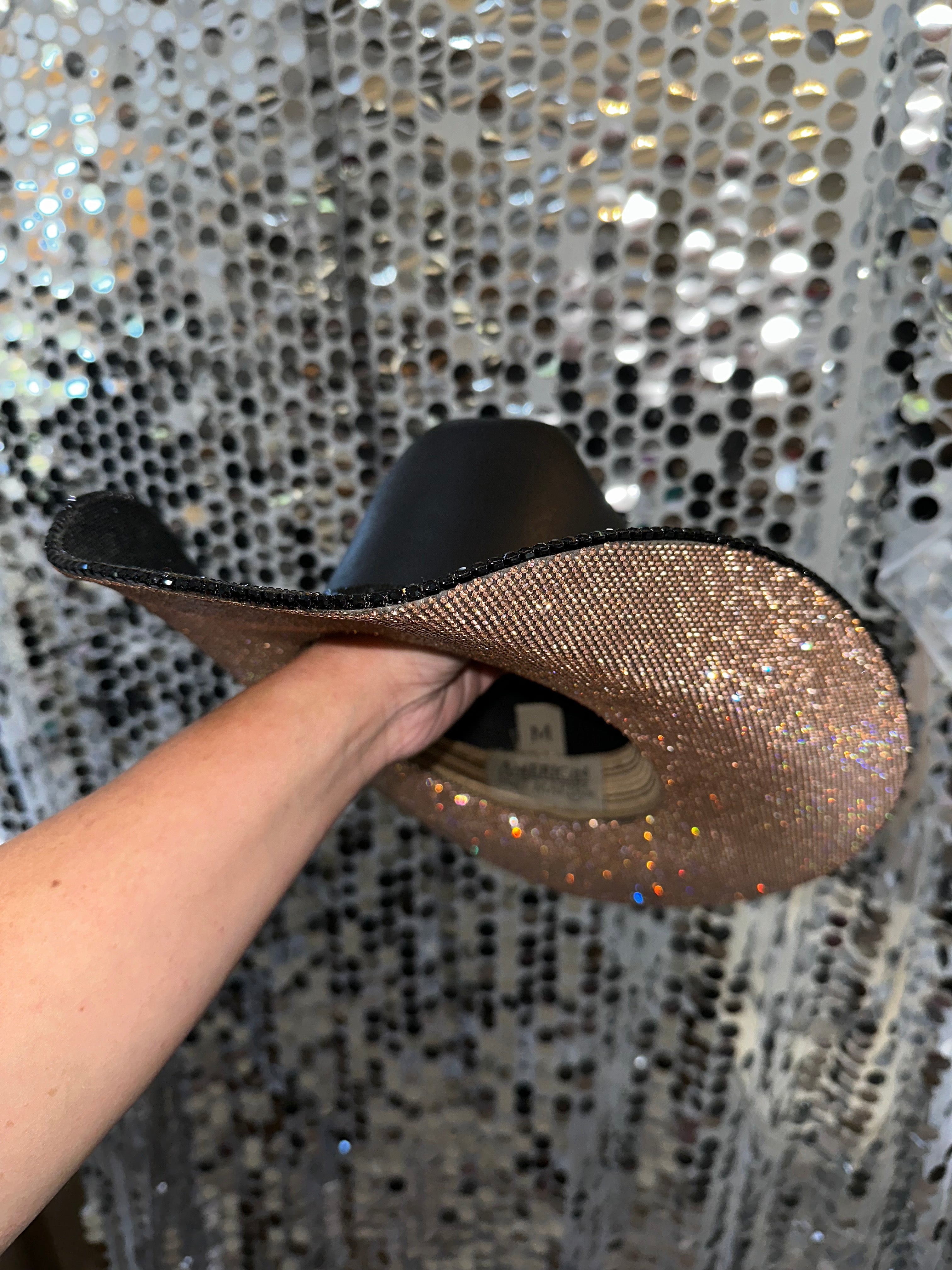 Select underneath brim only option to only have champagne rhinestones on the underneath brim with a champagne hat band (no black rhinestones on top.