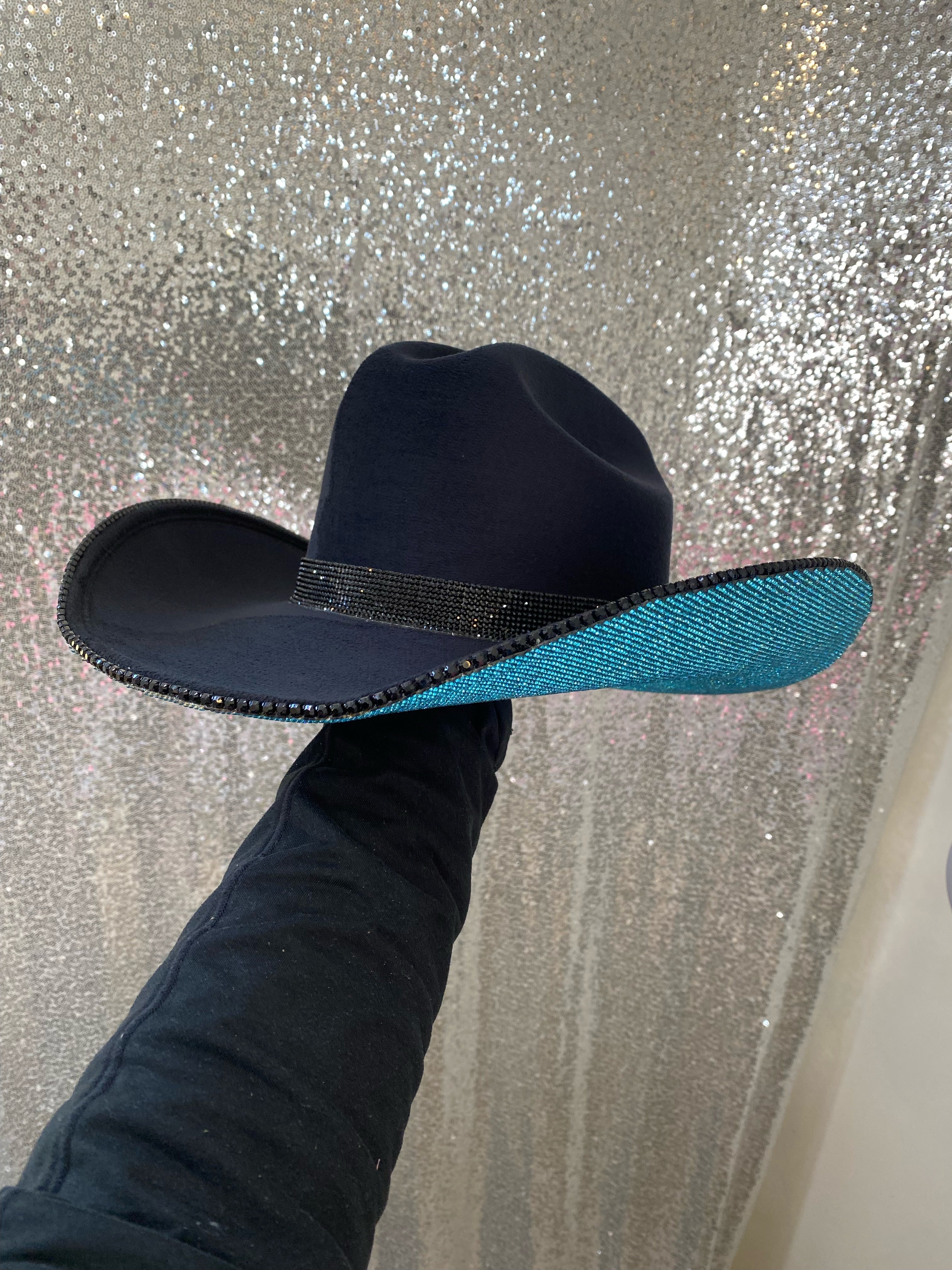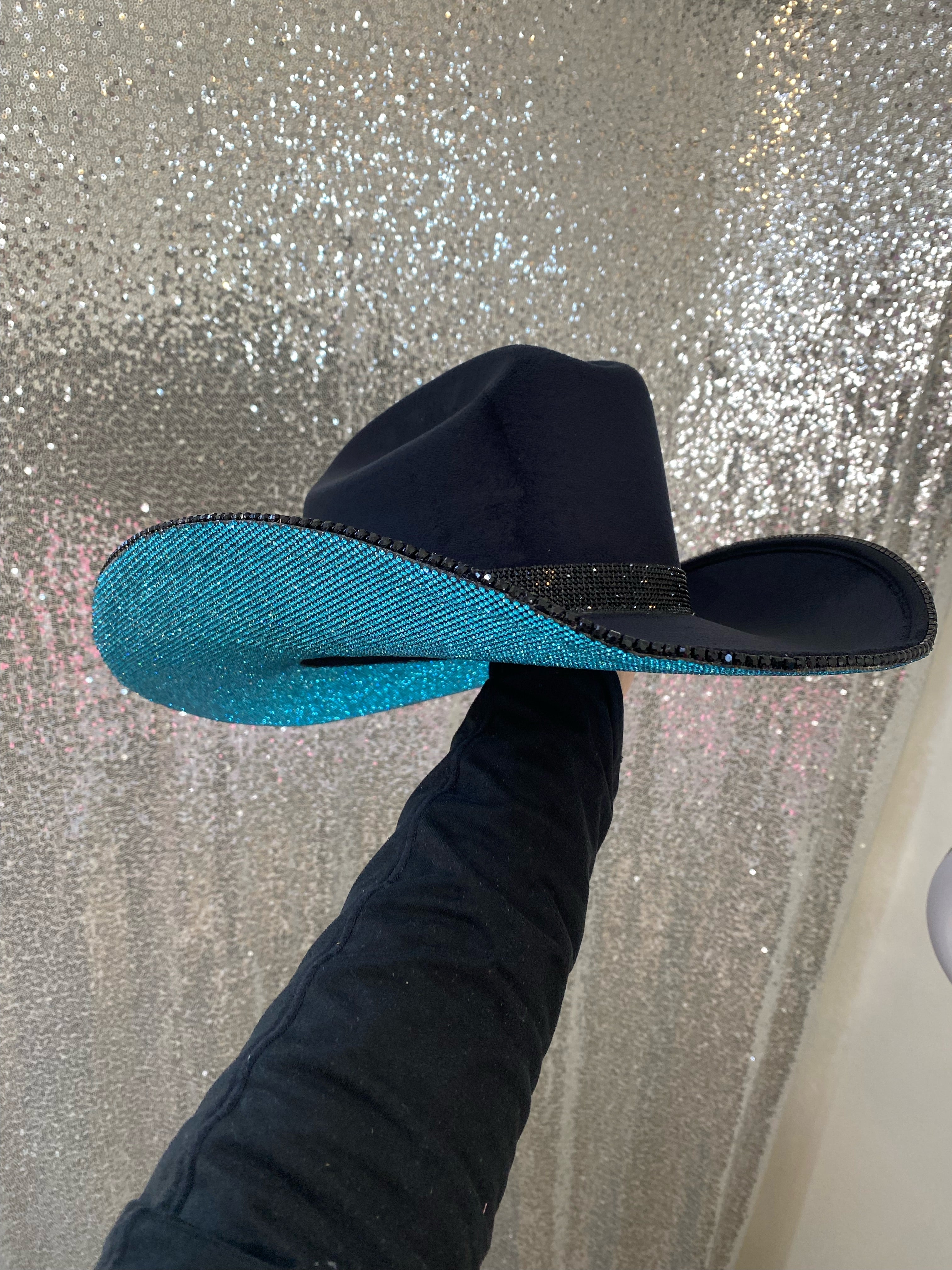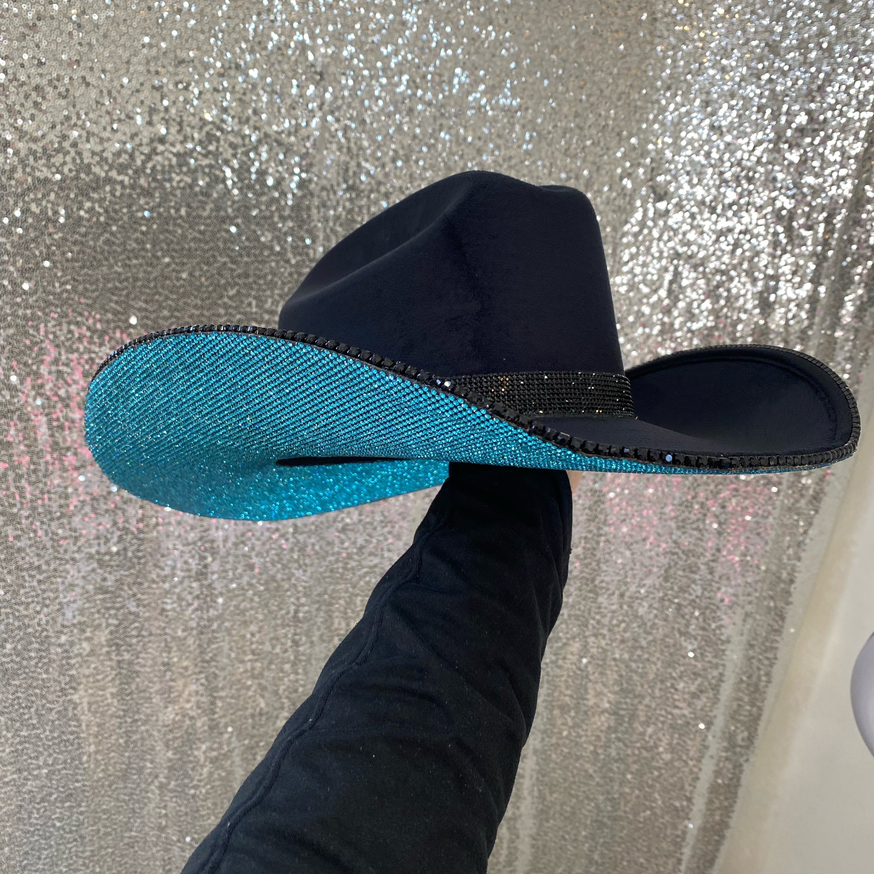 • Turquoise rhinestones on the underneath brim with a black hat band