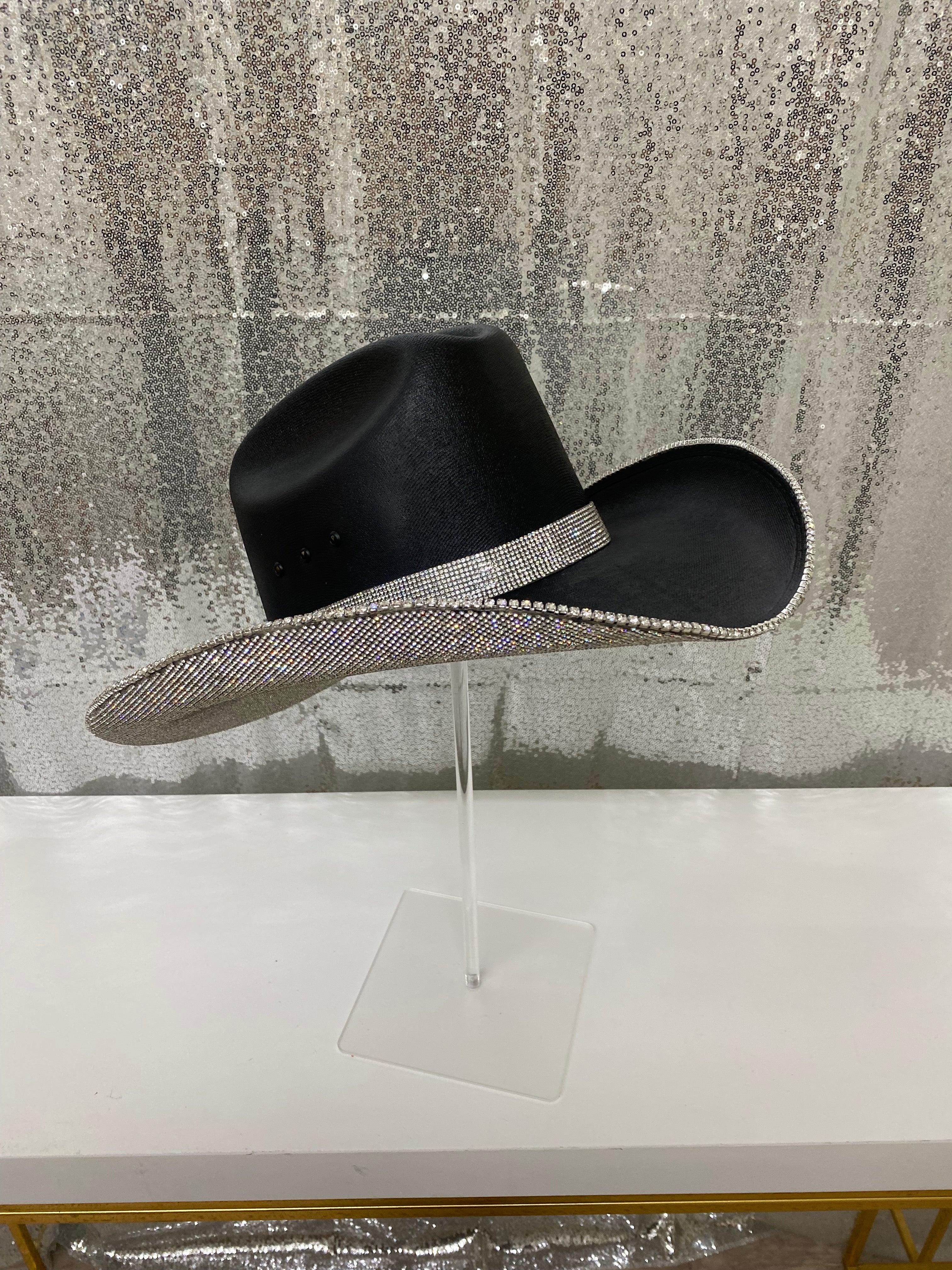 Our black and crystal hat features our black hat+ crystal rhinestones. Perfect for those wanting a fall or winter black hat, with the glam of the crystal rhinestones. One of our top sellers!