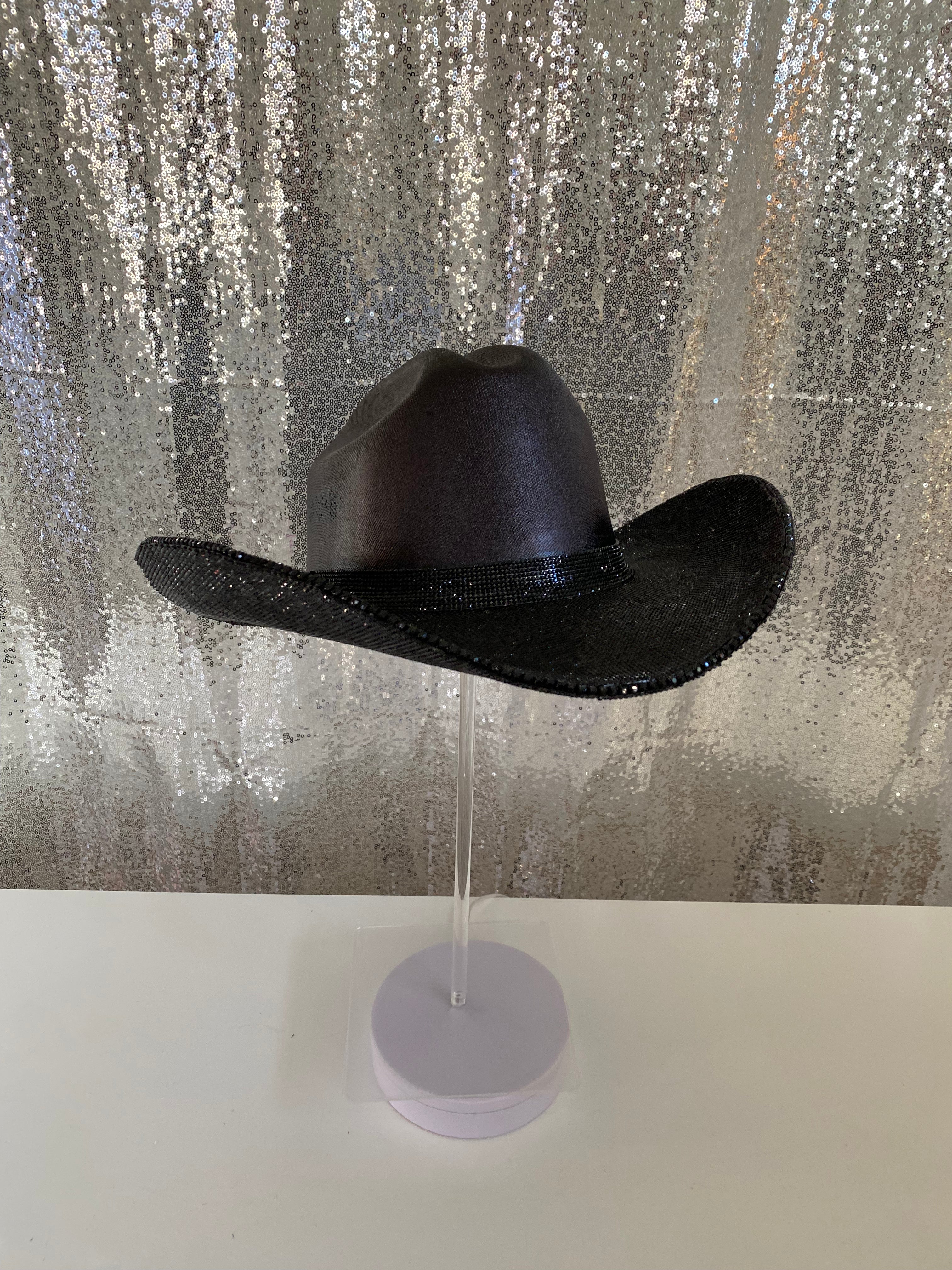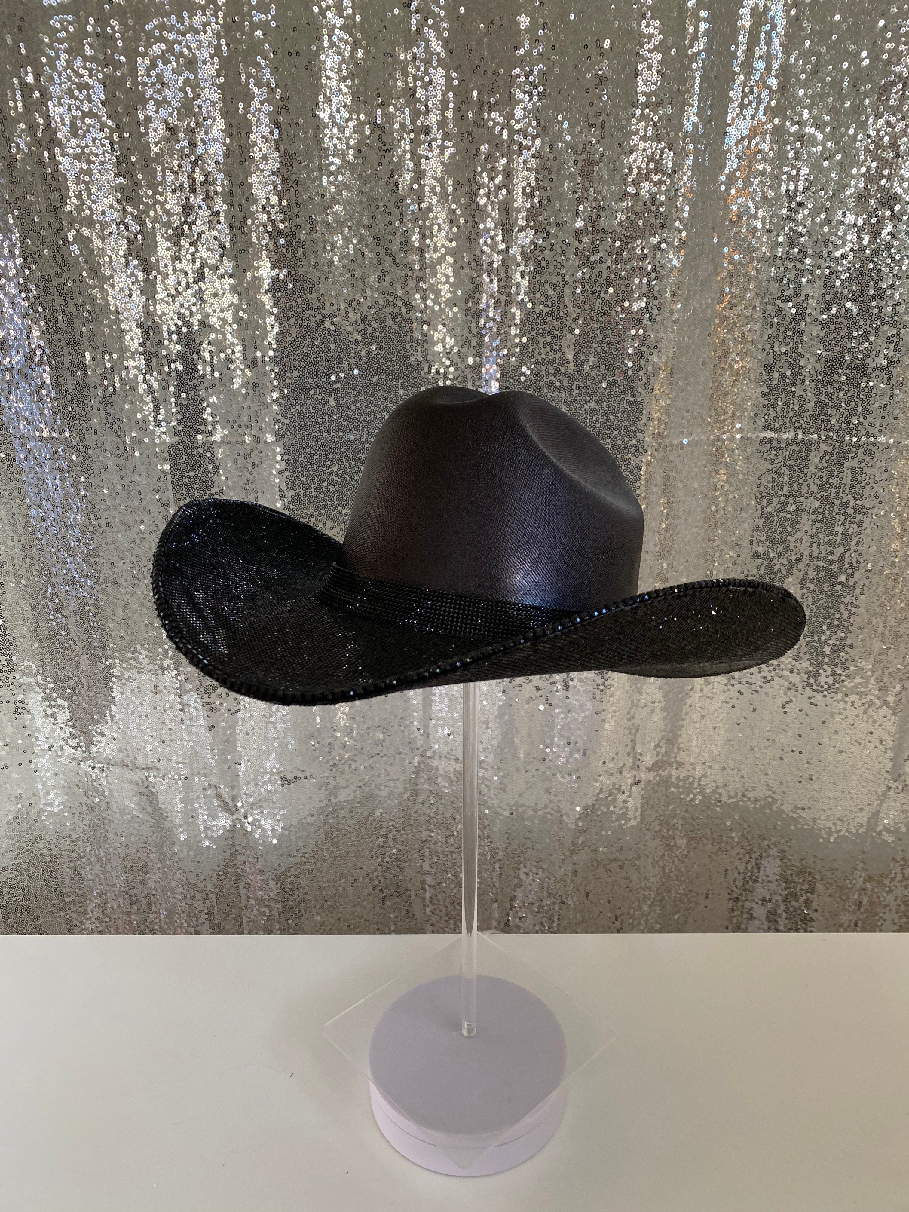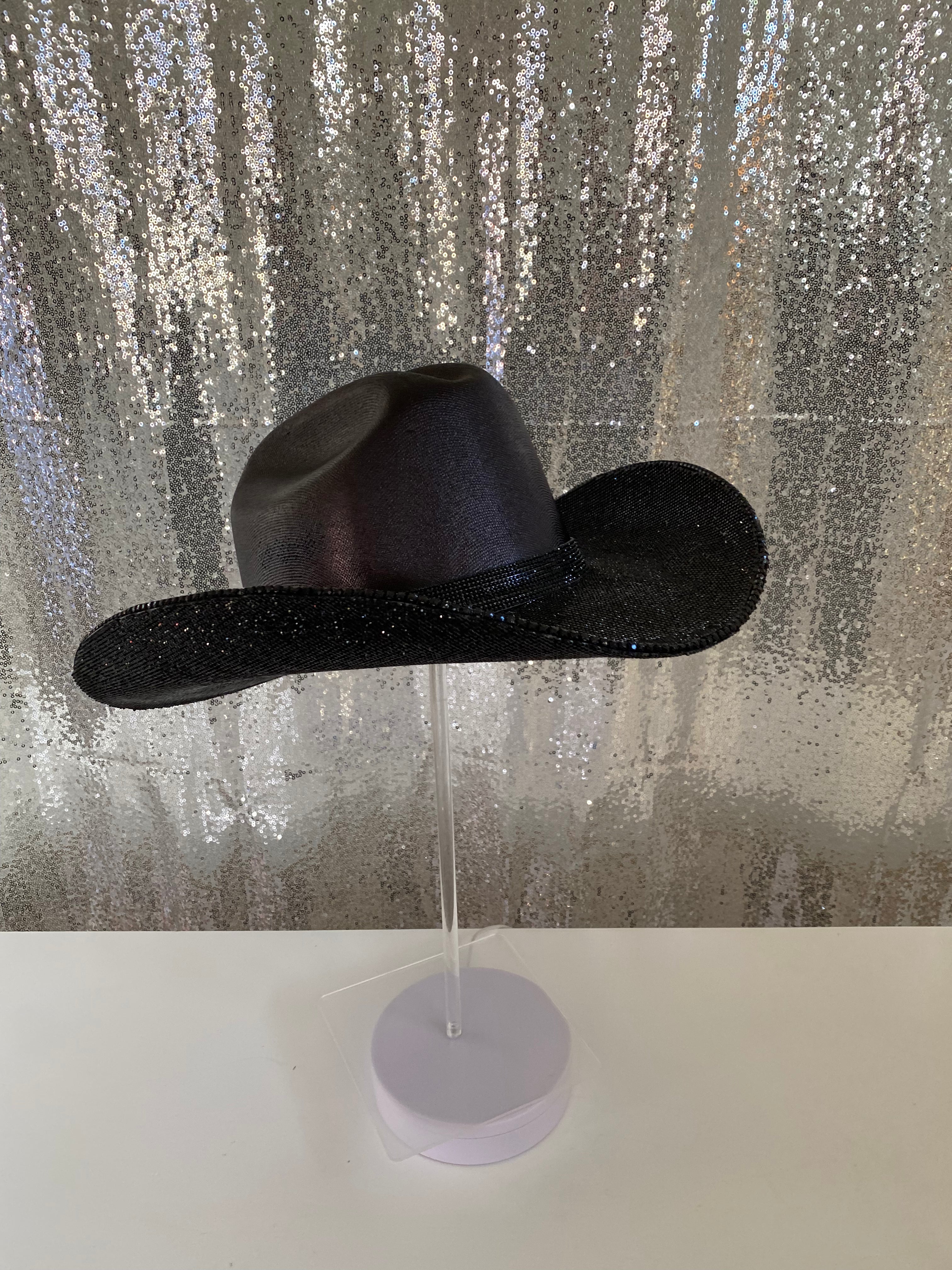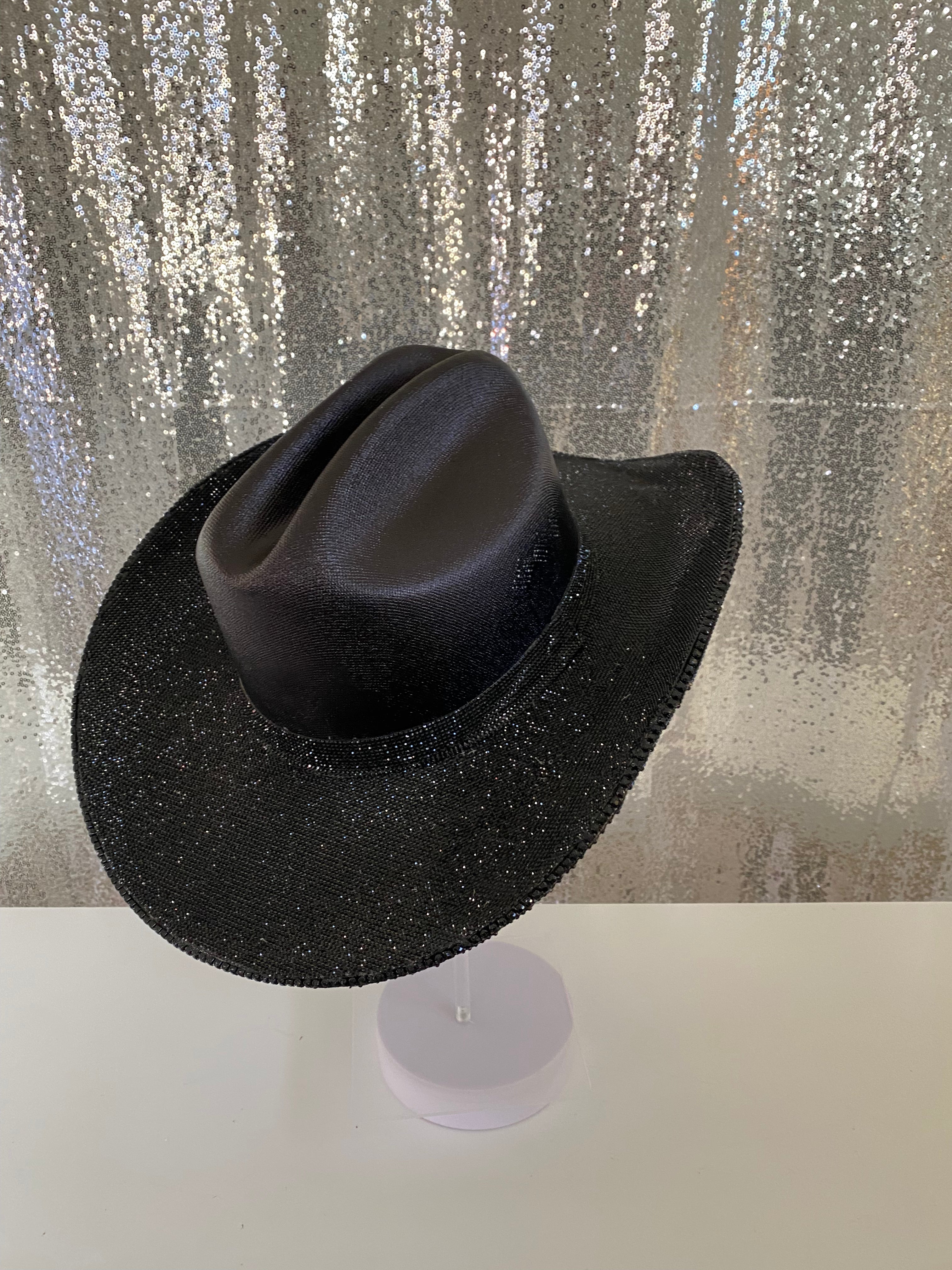Our "Blacked Out" hat features our black hat+ jet black rhinestones. Perfect for those wanting a rhinestone hat but with more of a slightly subdued look due to the black rhinestones. Don’t be fooled, this hat is gorgeous and the jet black rhinestones sparkle and shine! This can easily go with any outfit and can be worn all year long.