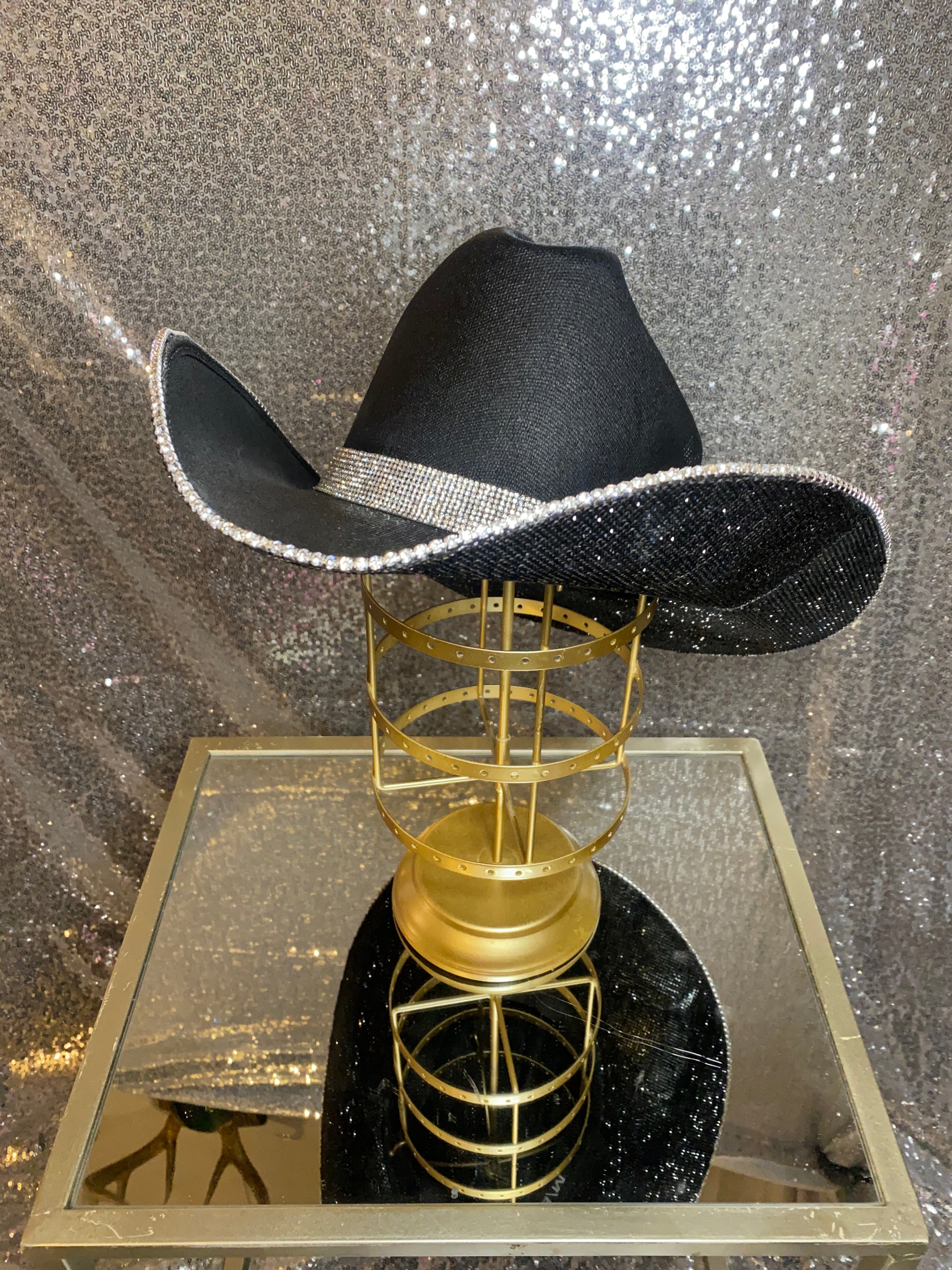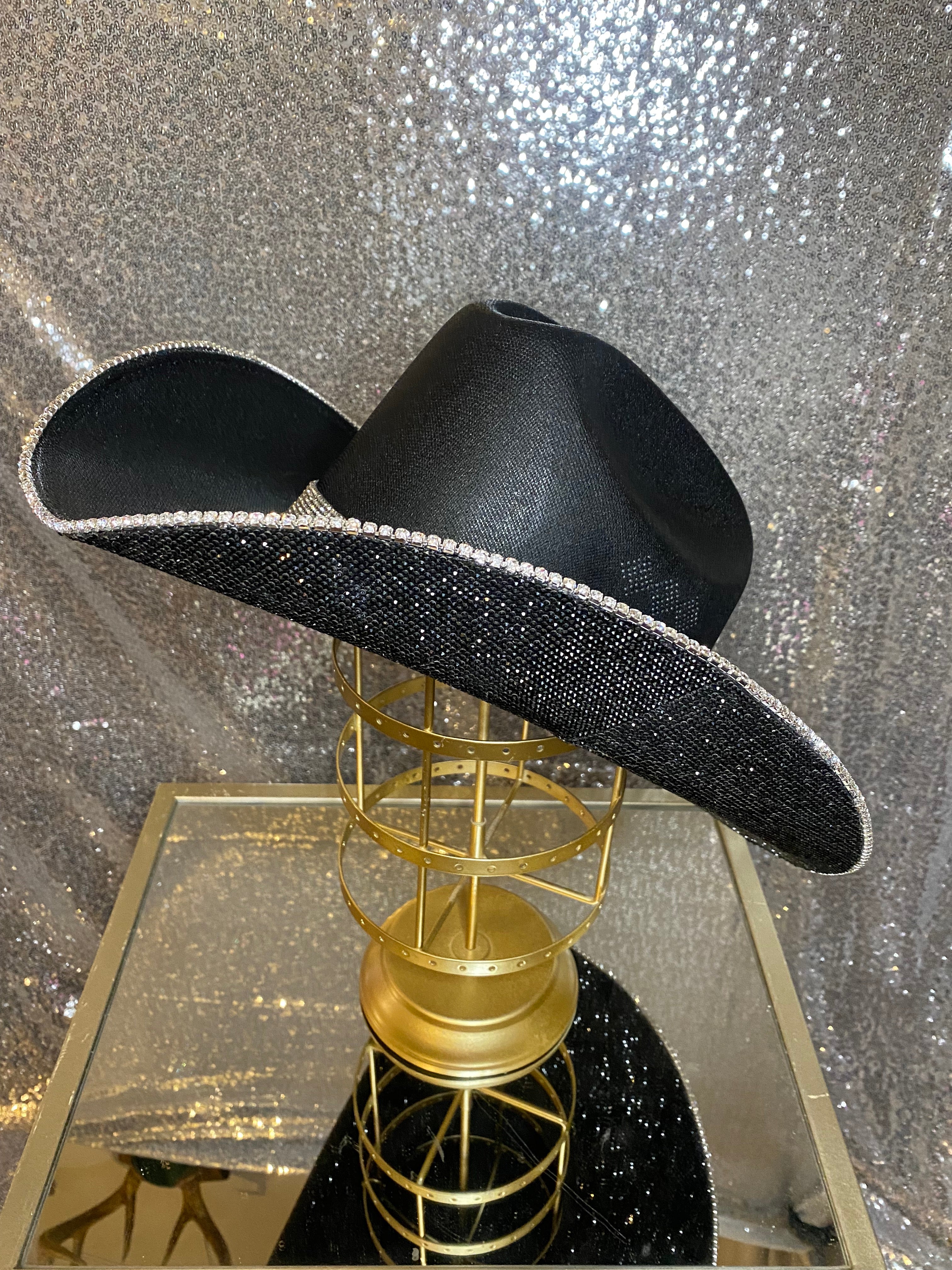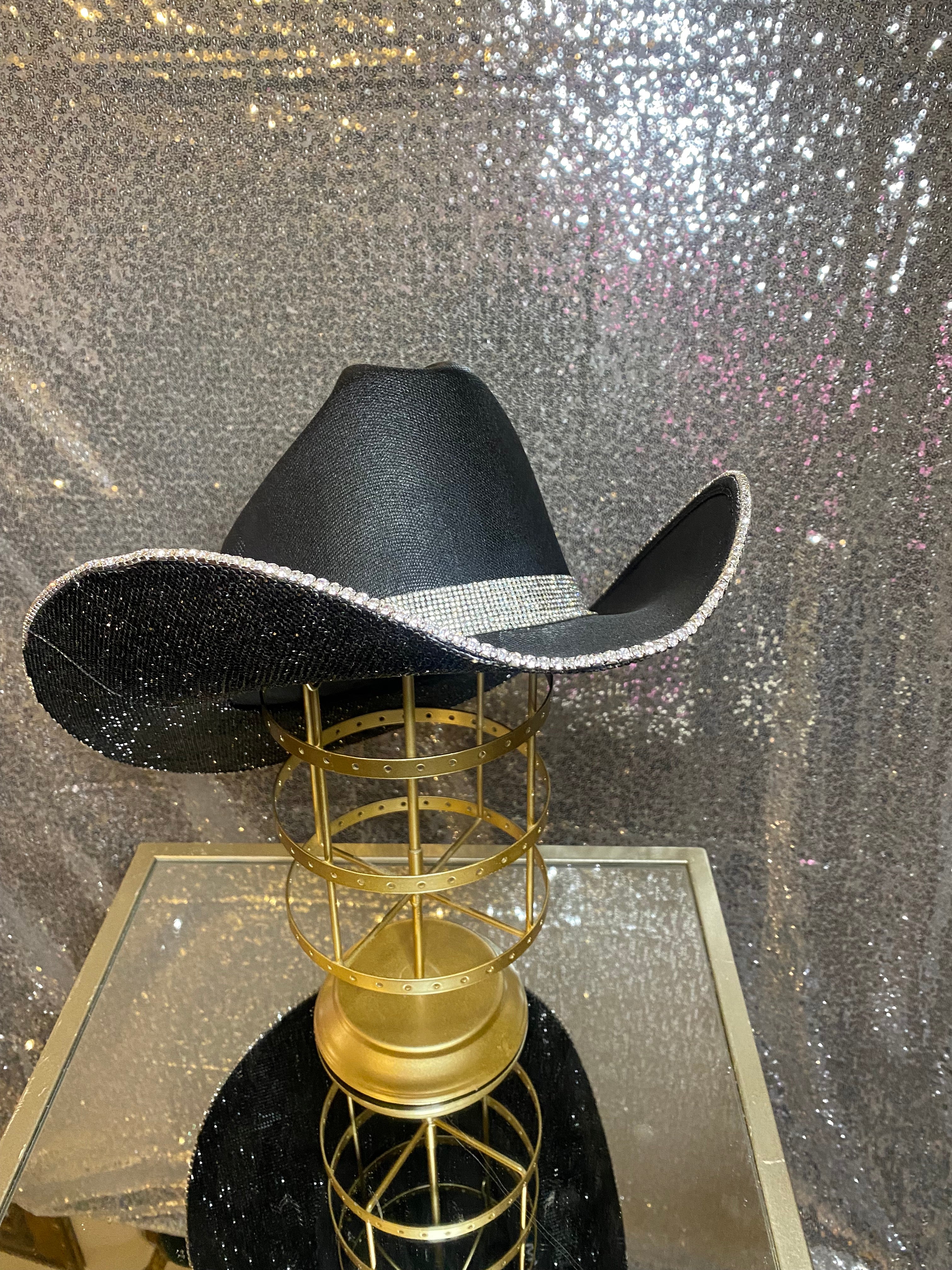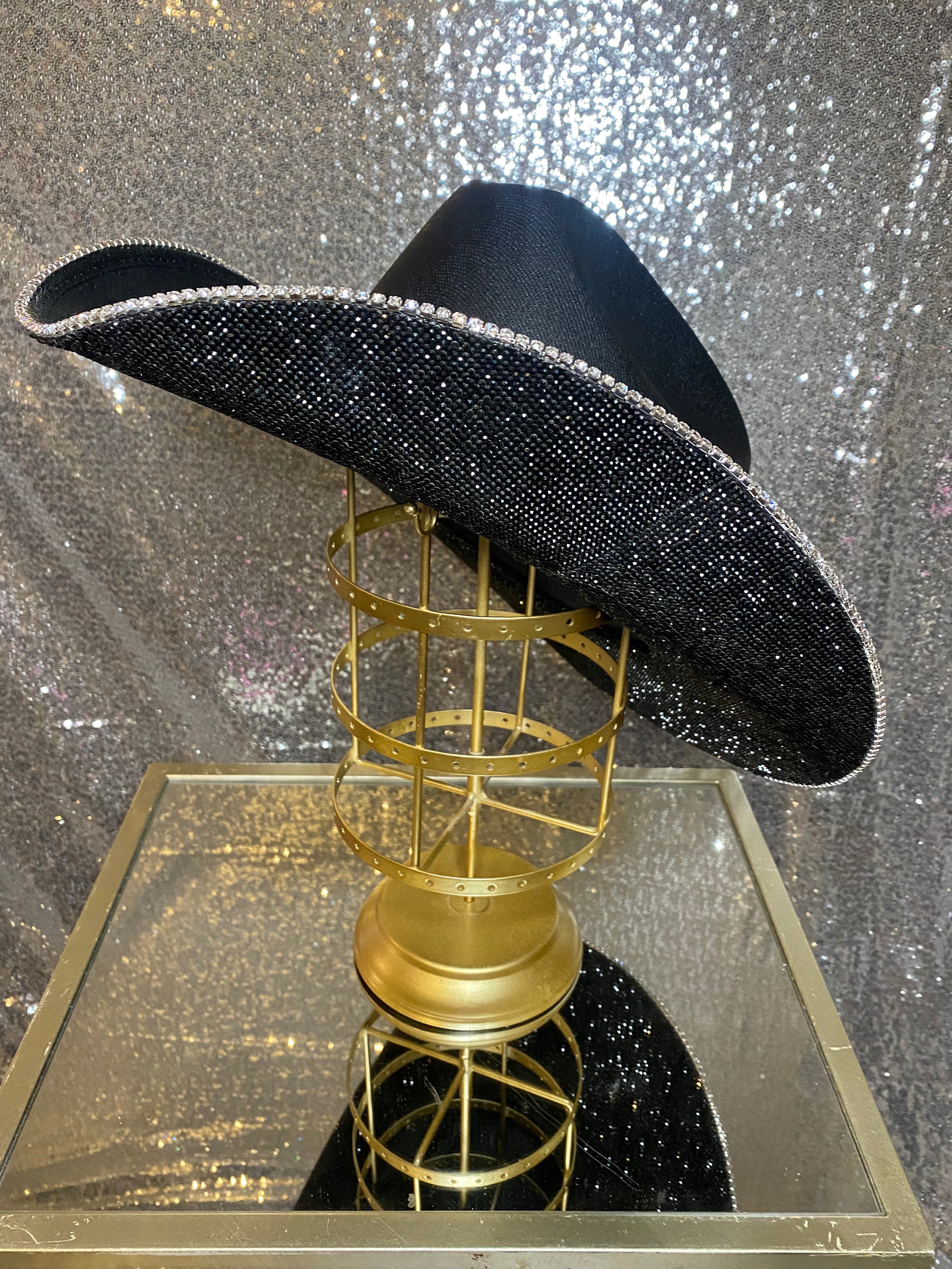 This listing features our black hat + jet black rhinestones and crystal trim on the edges and a crystal hat band.