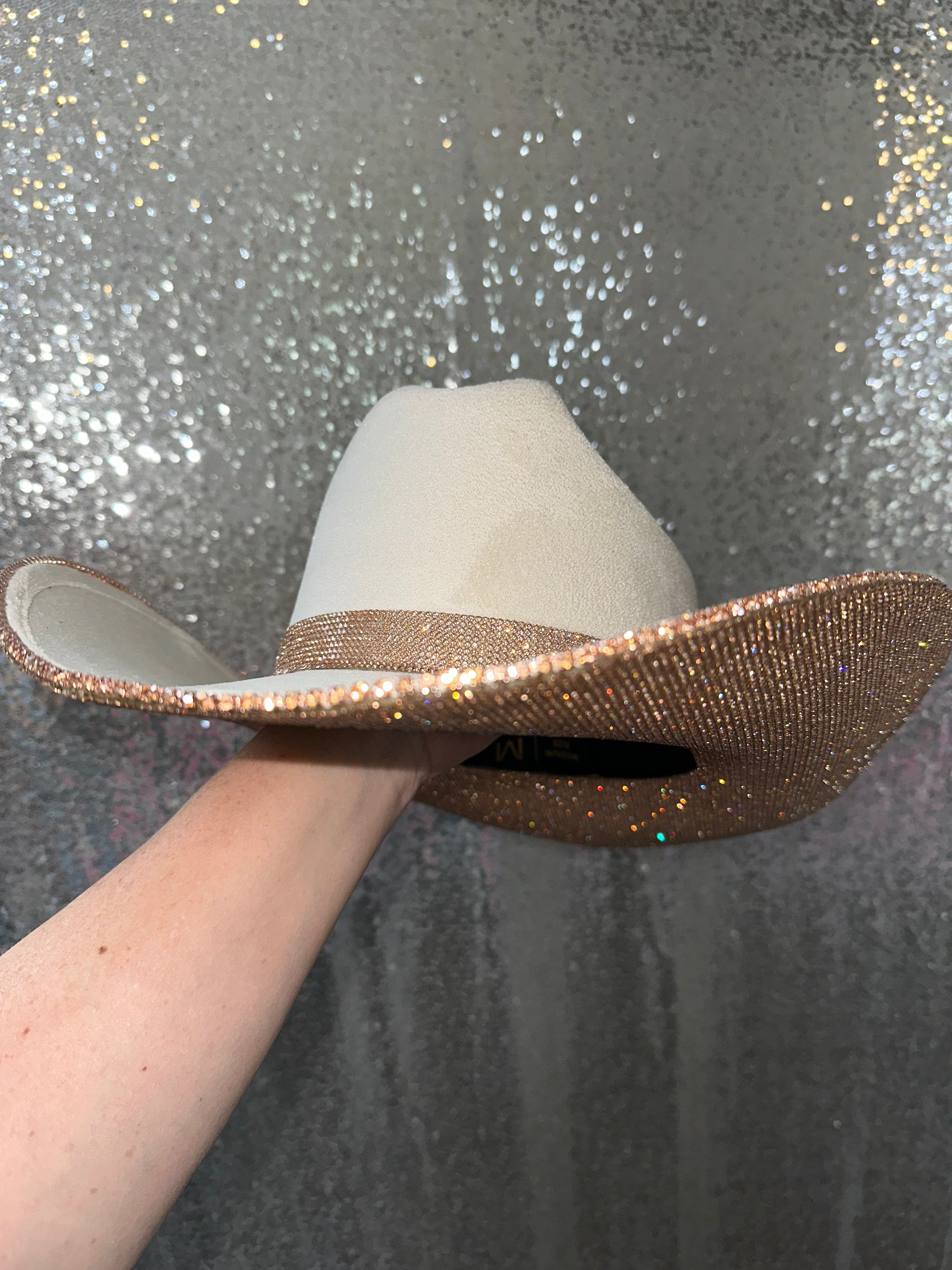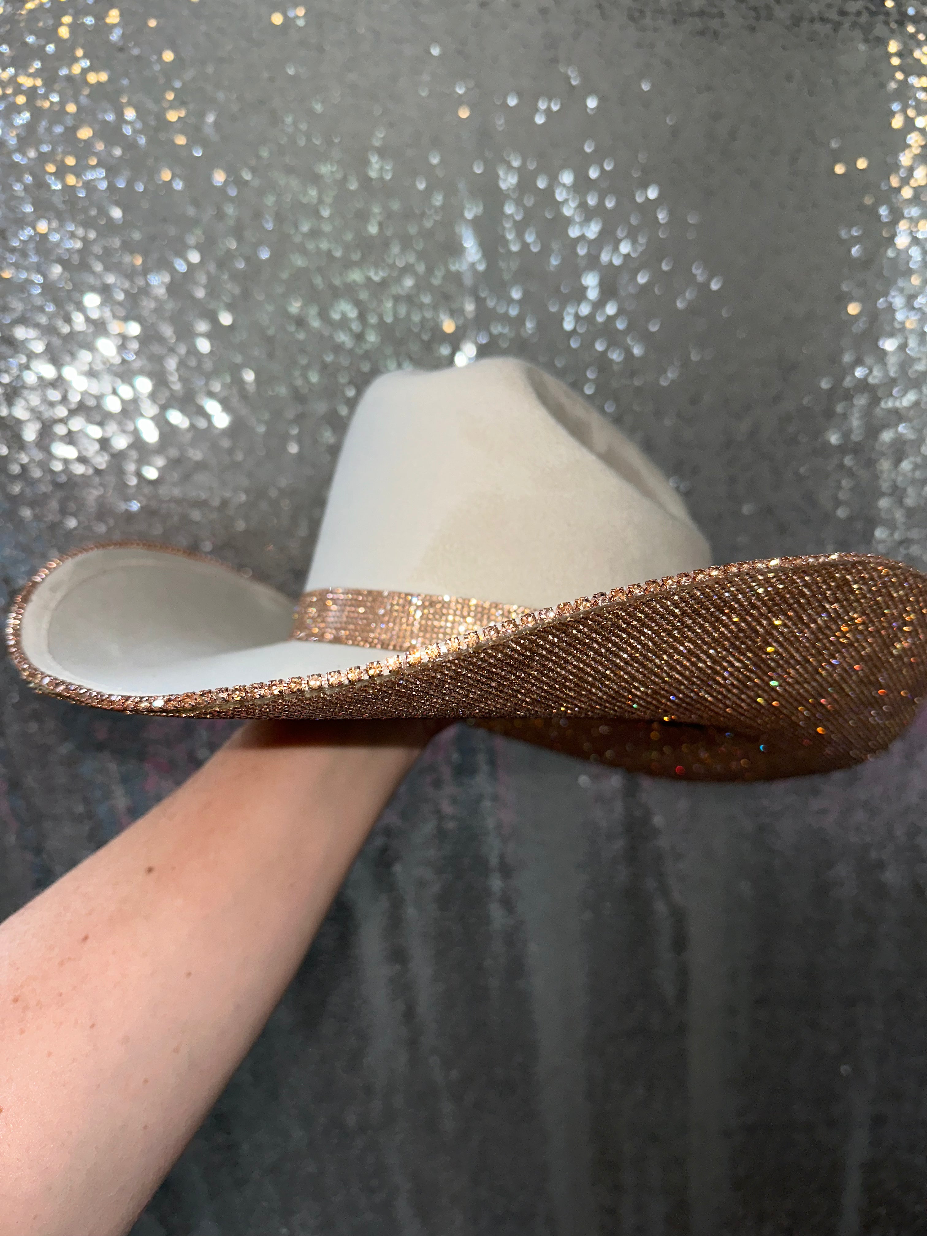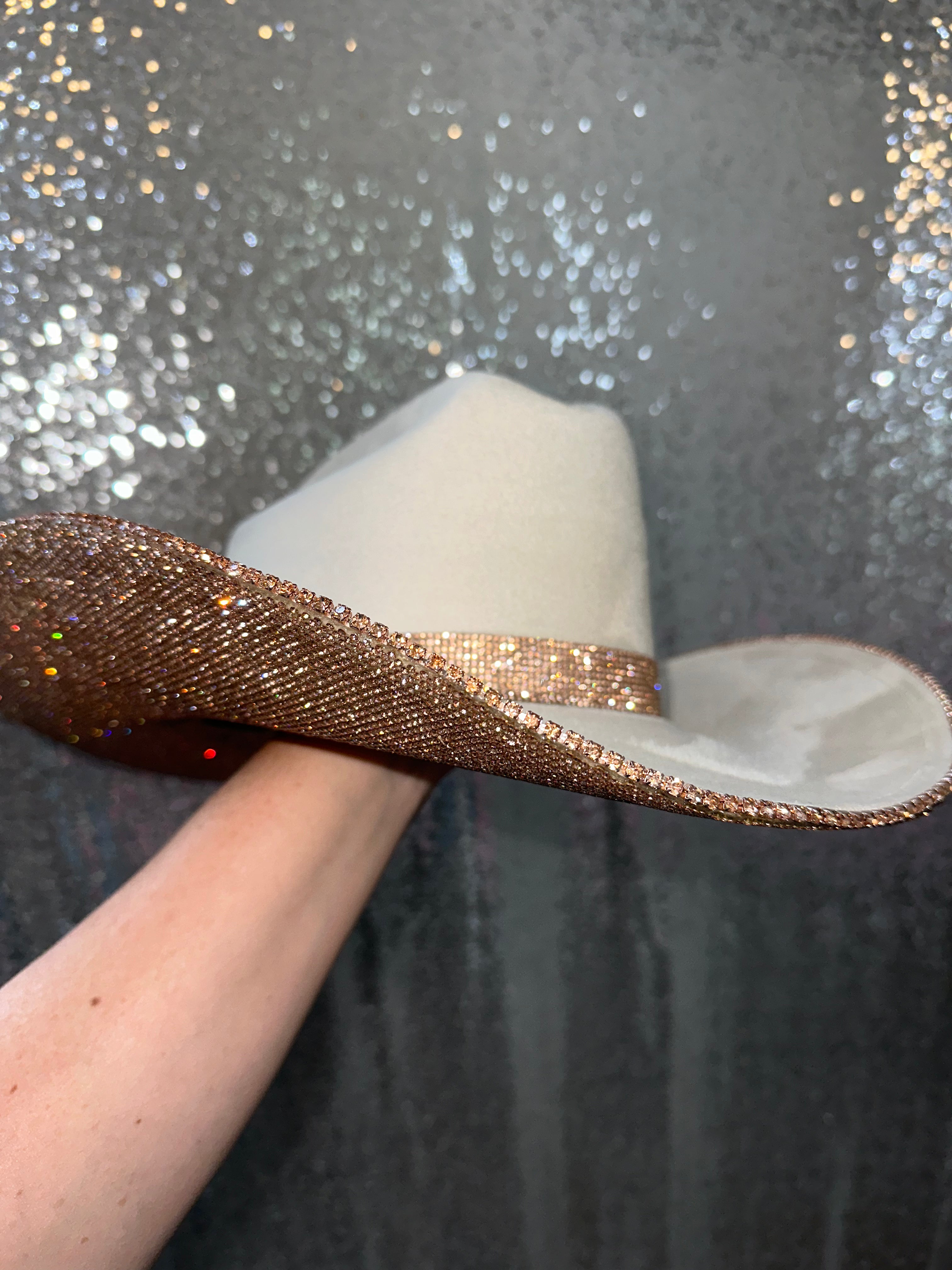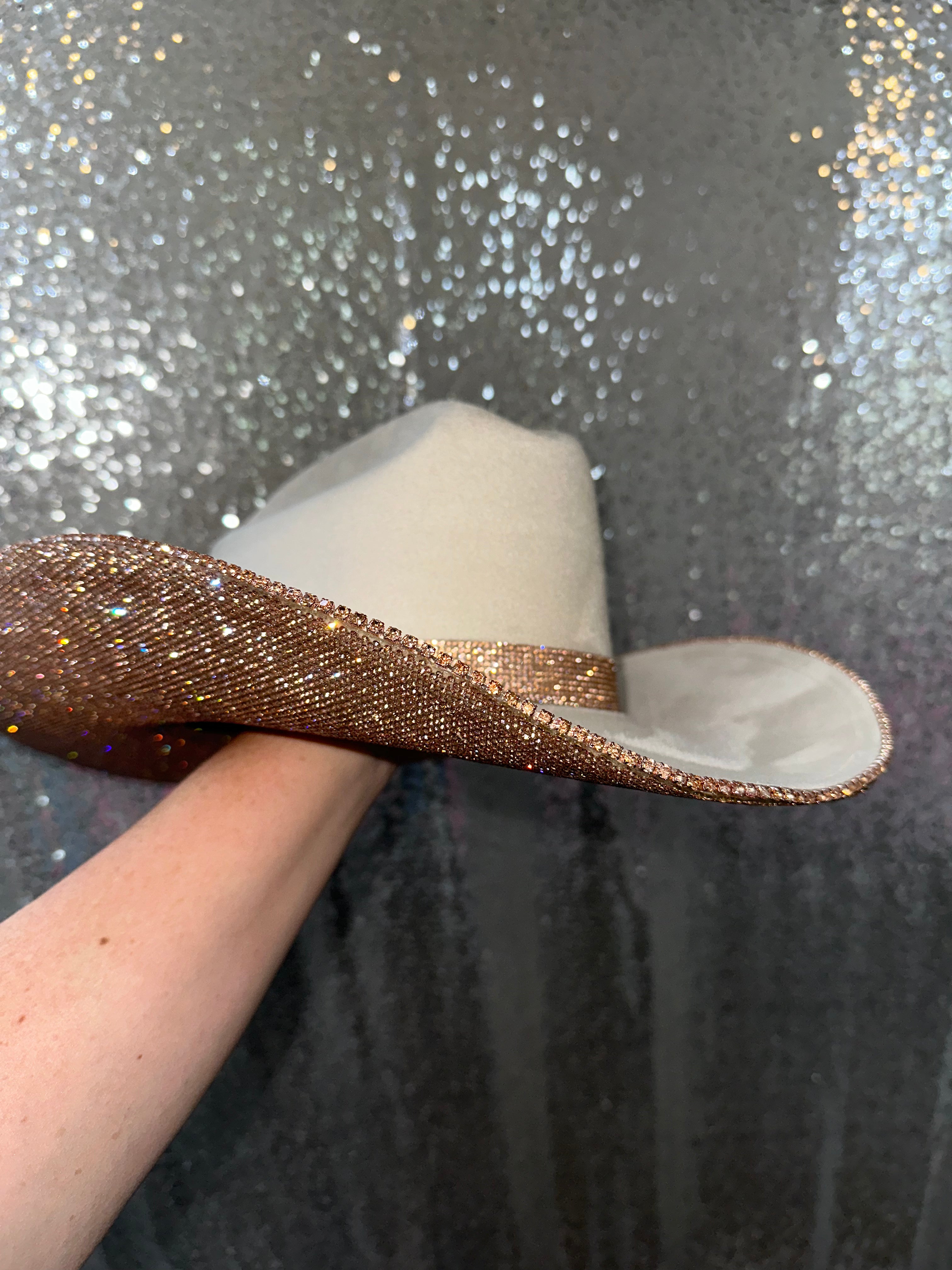 • Champagne rhinestones on the underneath brim with a matching champagne rhinestone hat band and trim