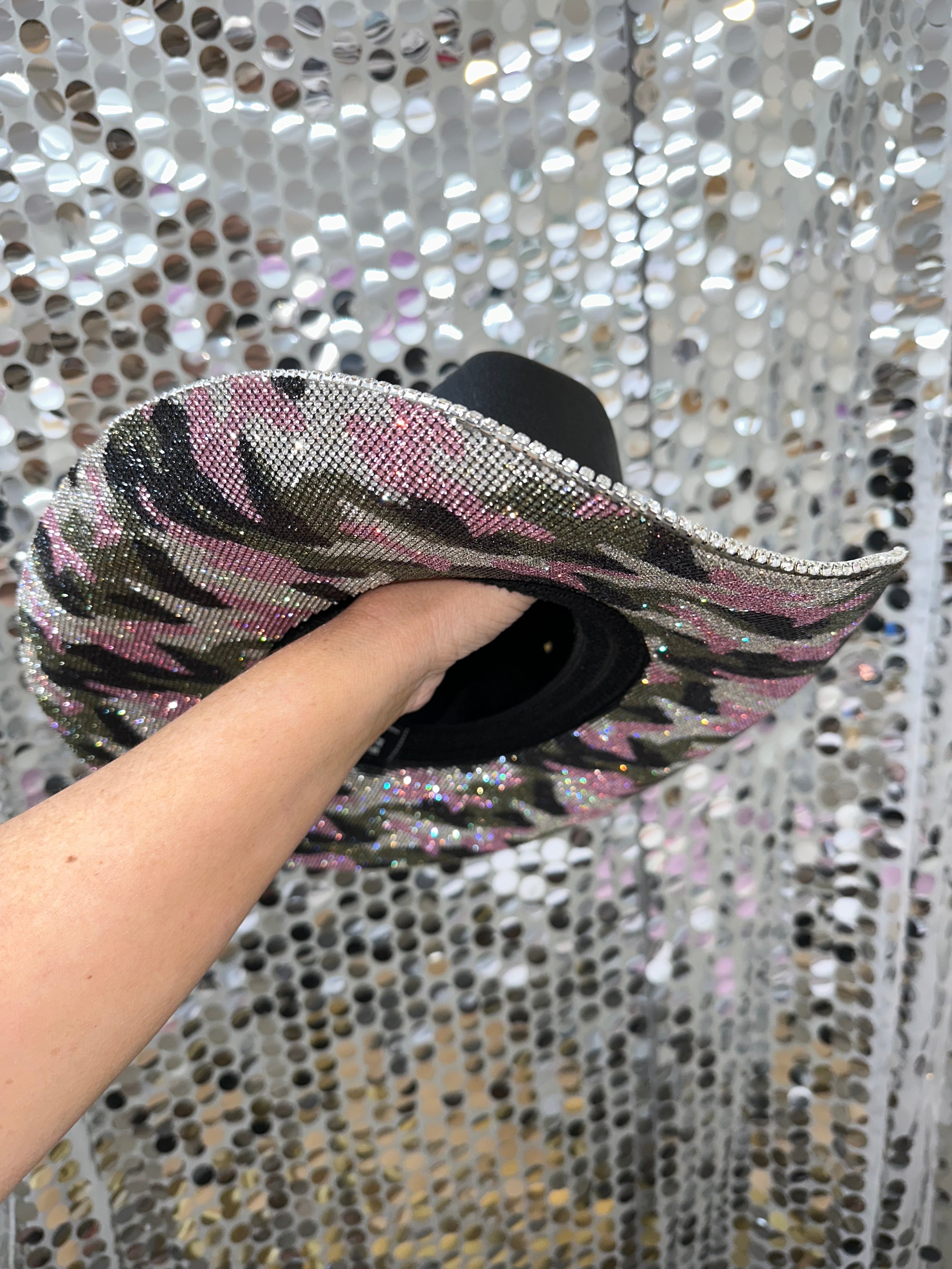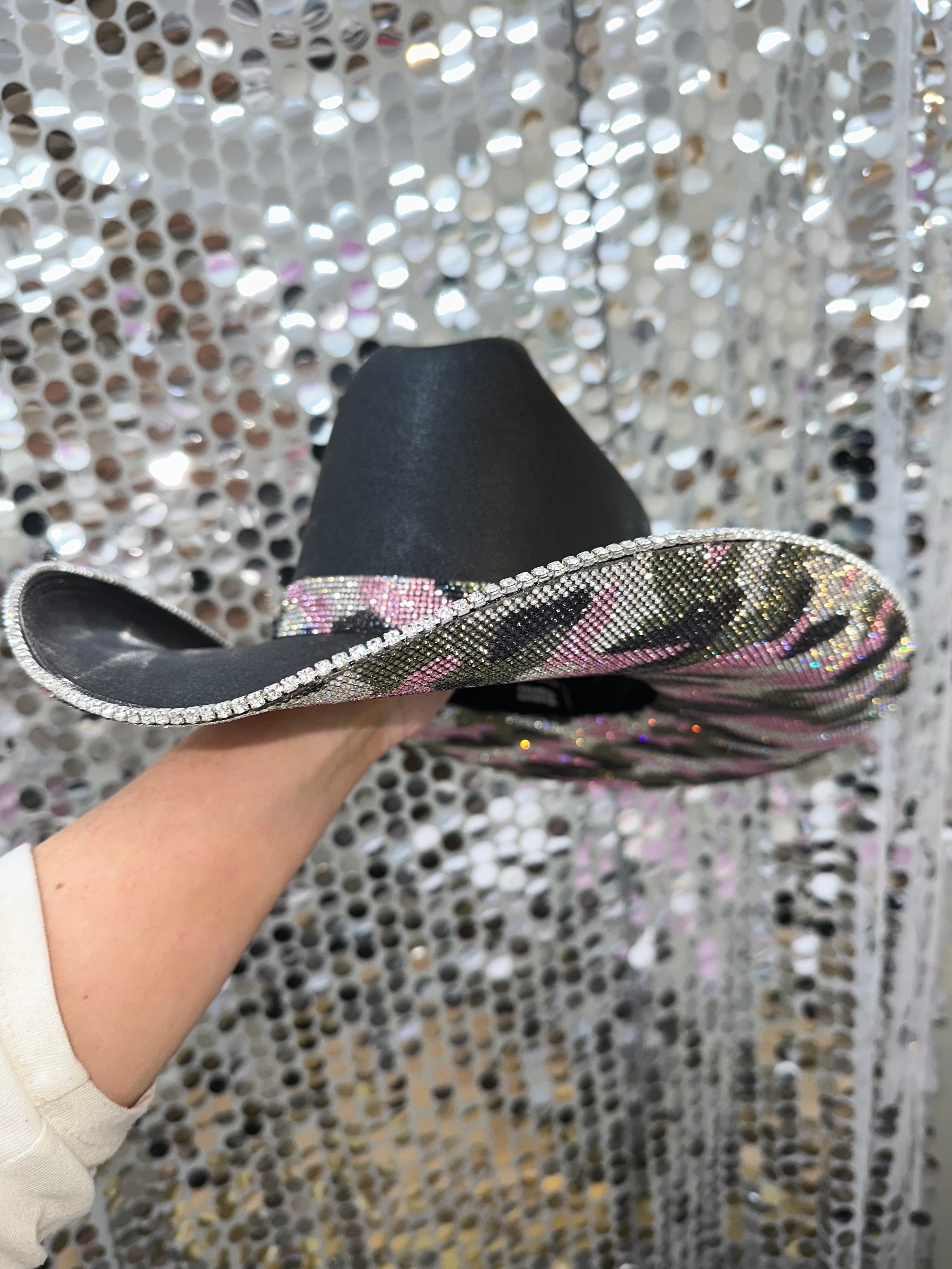 Our black straw hat with our custom pink camo print rhinestones! Perfect for those country girls heading to a party, wanting to stand out and be one of a kind. These are limited edition!