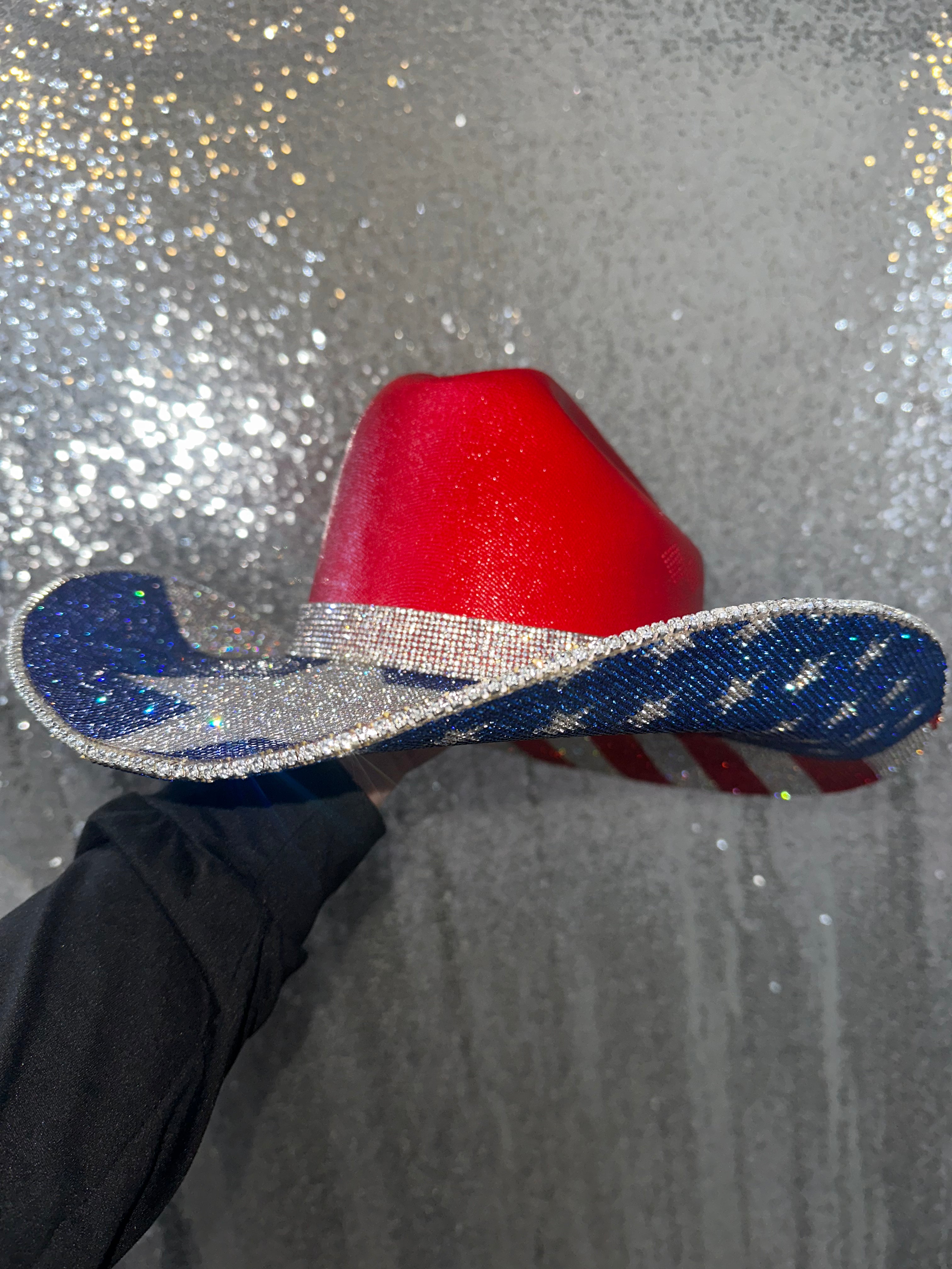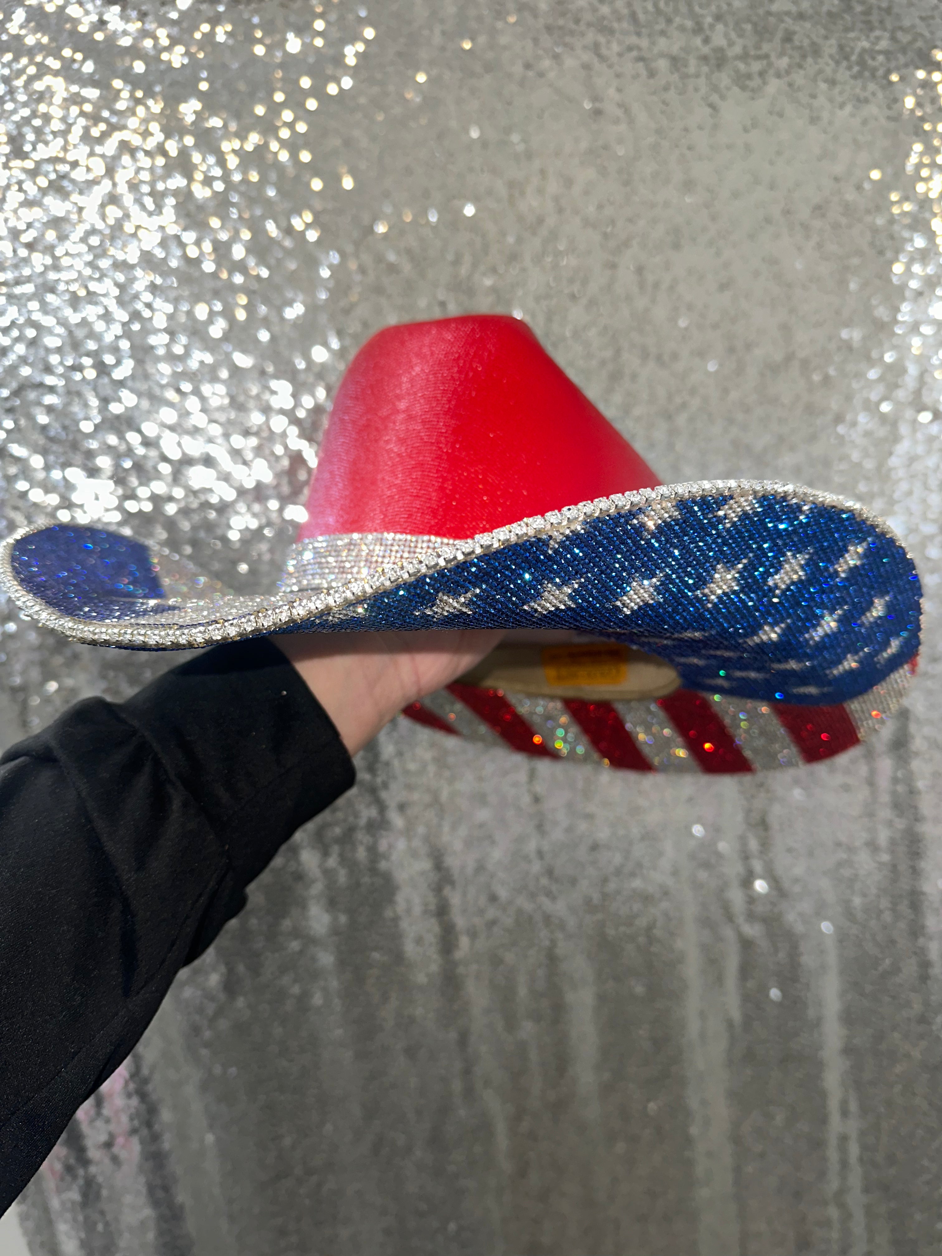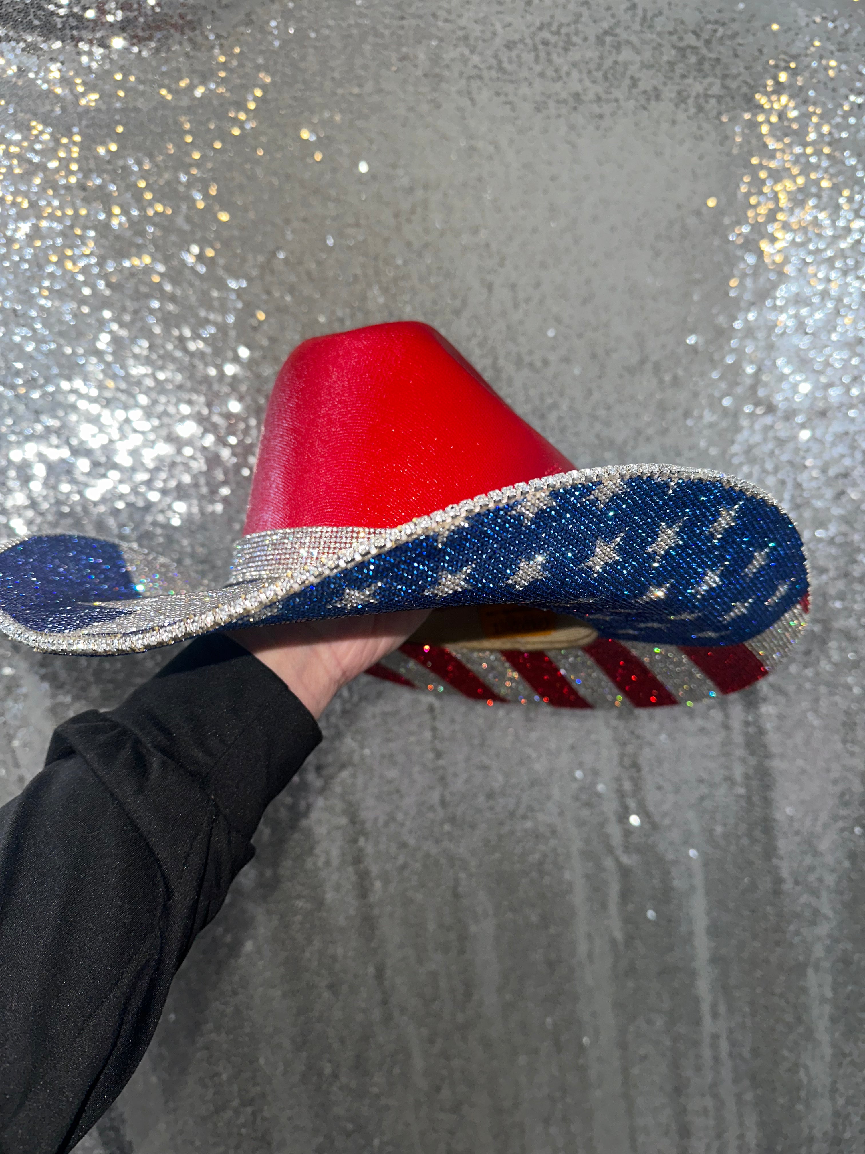 • Both brims rhinestoned WITH CRYSTAL on top brim option - American Flag print rhinestones on the bottom brim and crystal rhinestones on the top brim with a crystal hat band