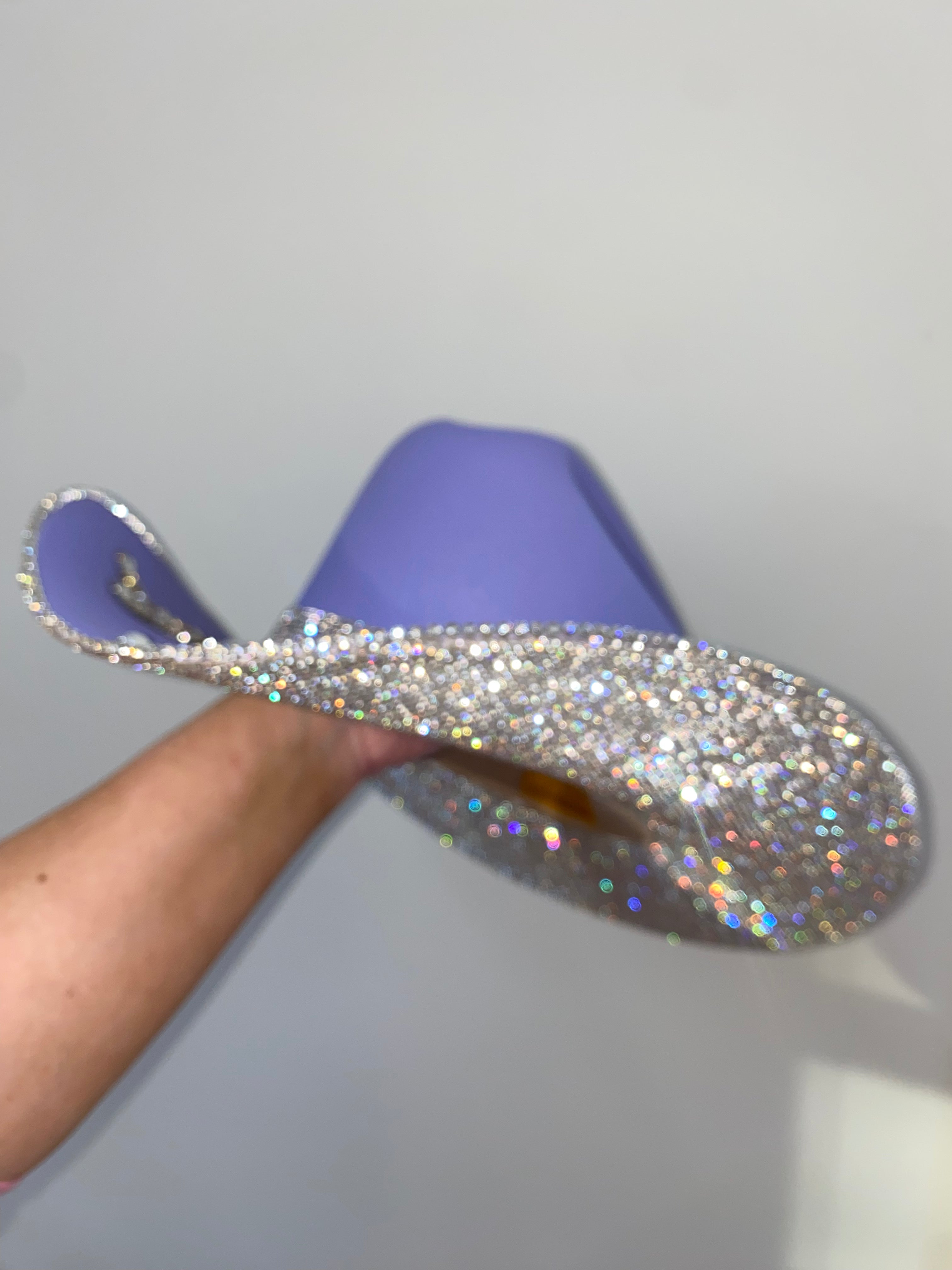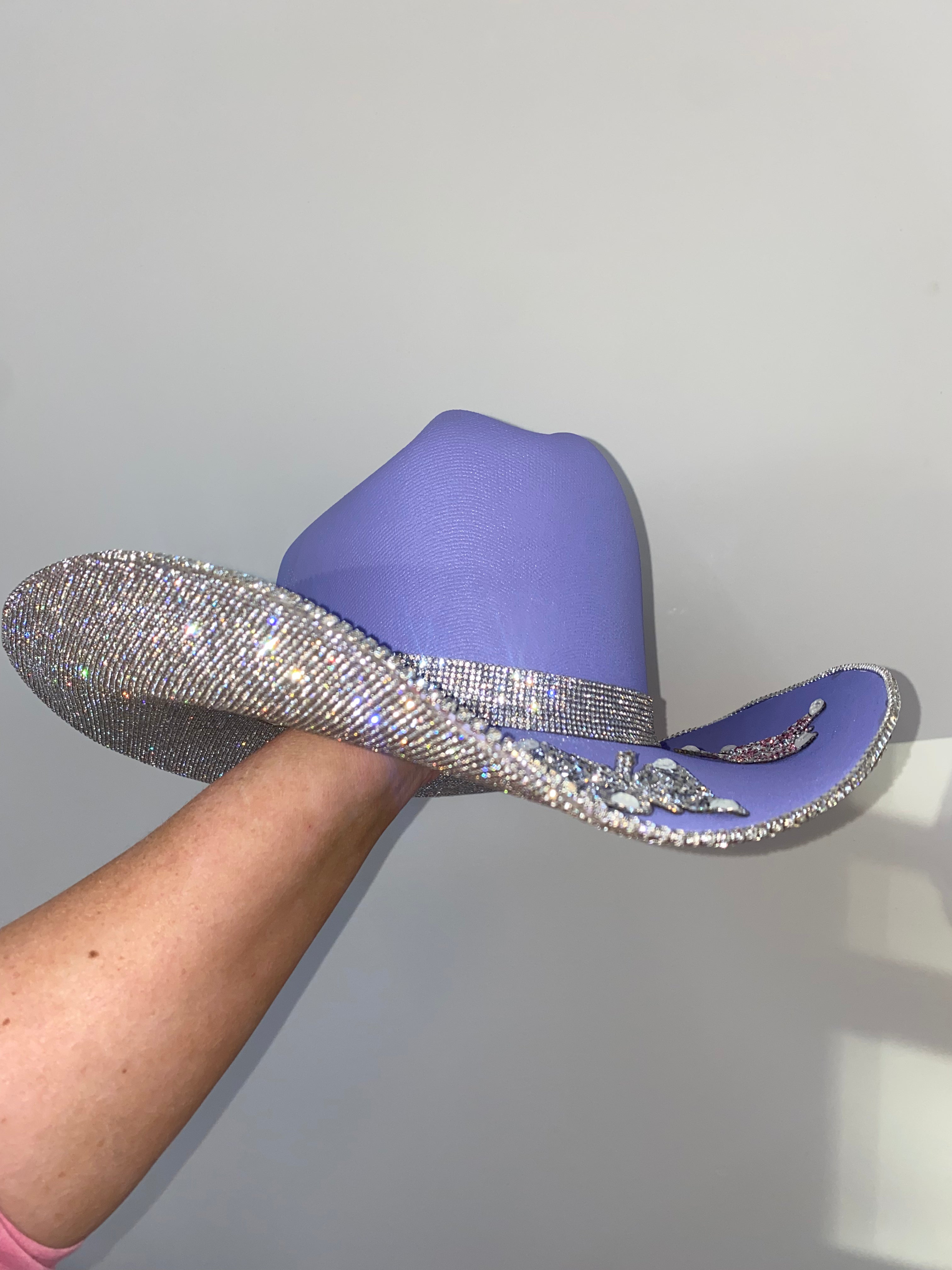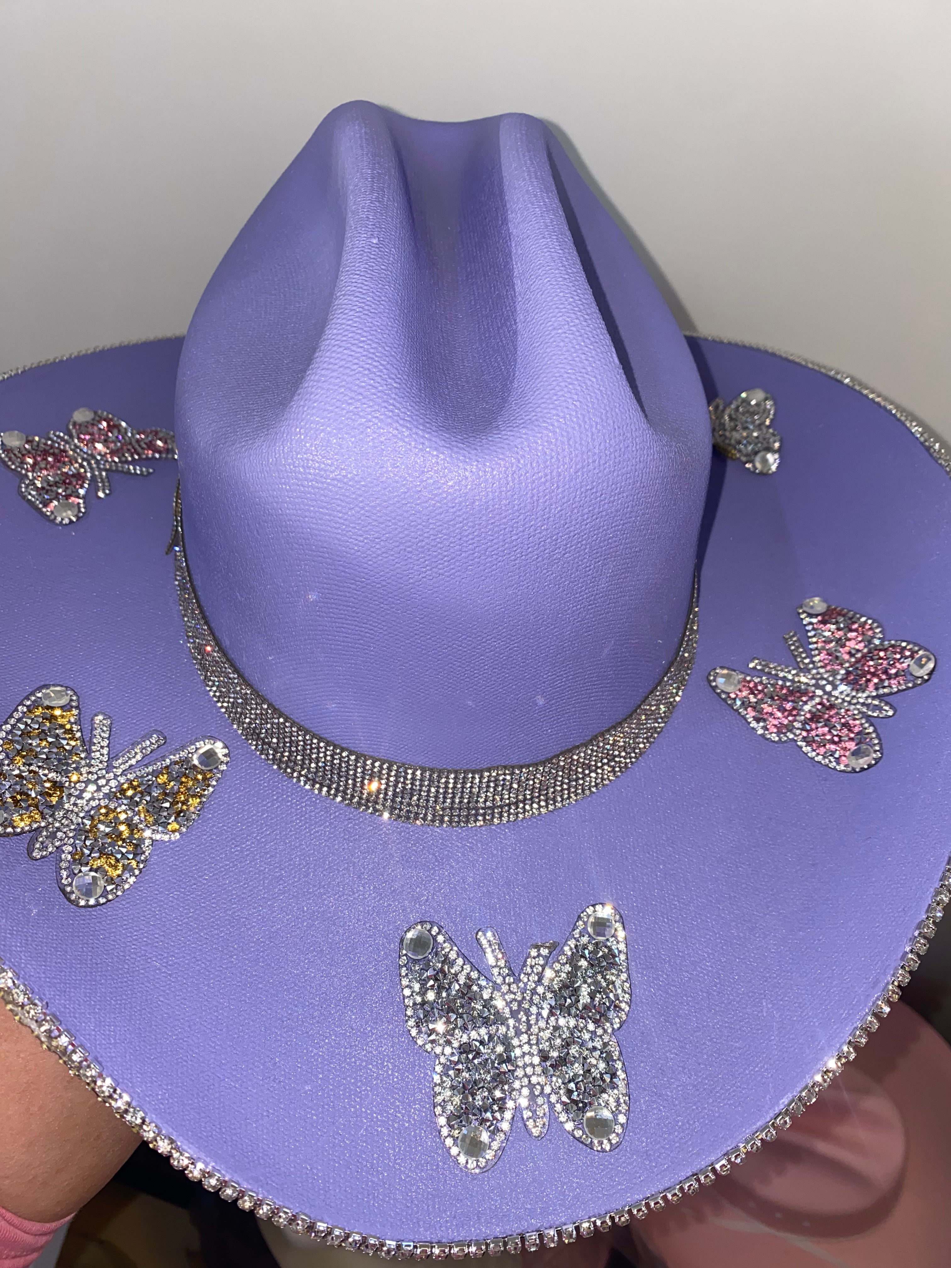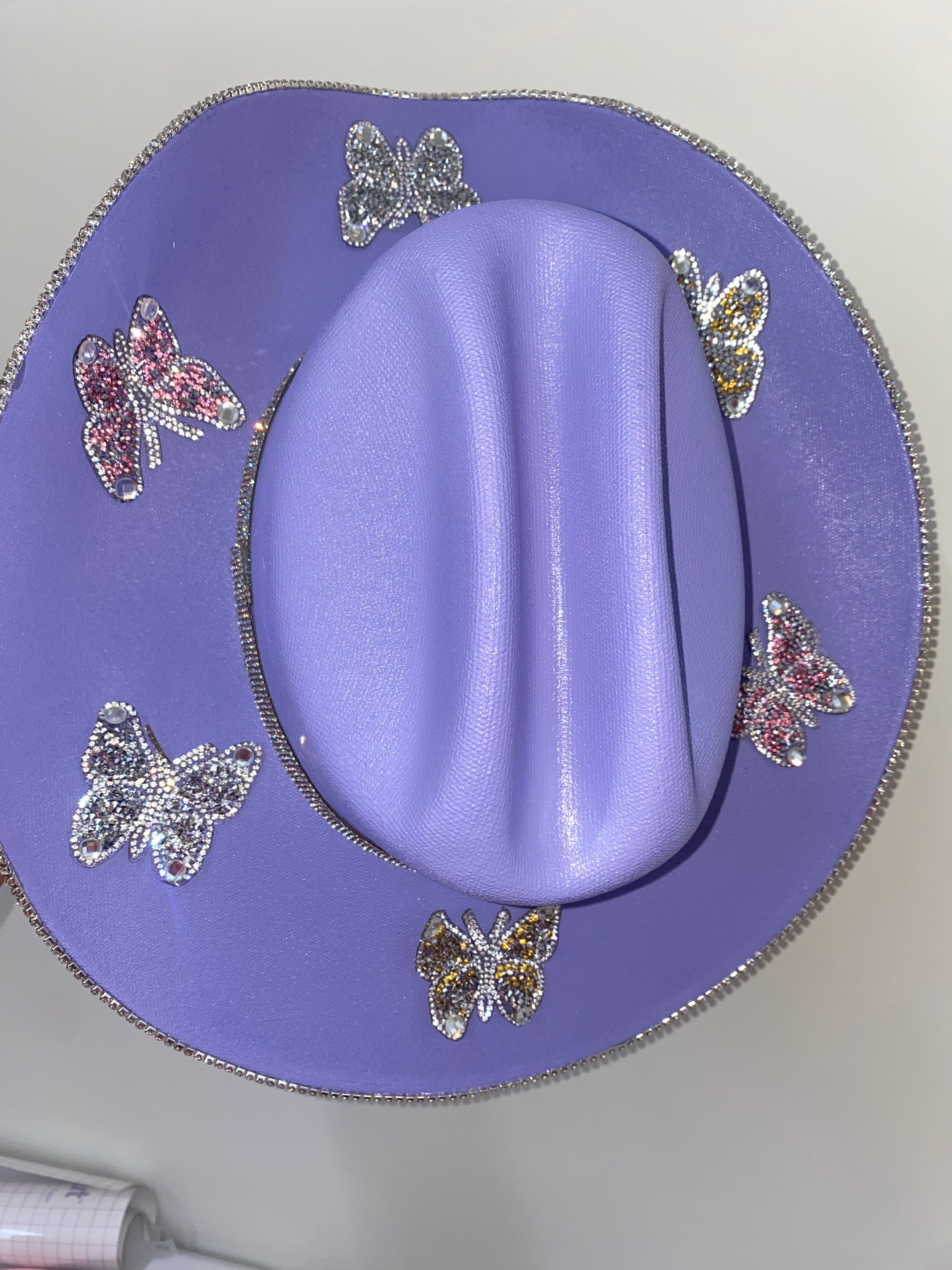 Inspired by Taylor Swift's Eras Tour, we custom made a purple hat with crystal rhinestones and six multi colored rhinestone butterflies on the top brim. Talk about perfection!