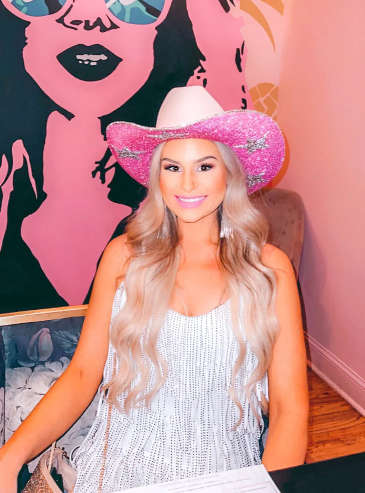 The “Krista Horton” hat is named after fashion influencer & blogger Krista Horton (Instagram @krista.horton) who created this hat for a country concert she attended. This hat features pink rhinestones on both brims with silver stars on both brims. It has a matching pink rhinestone hat band and crystal trim around the edges. This hat is for all our girls who LOVE pink!