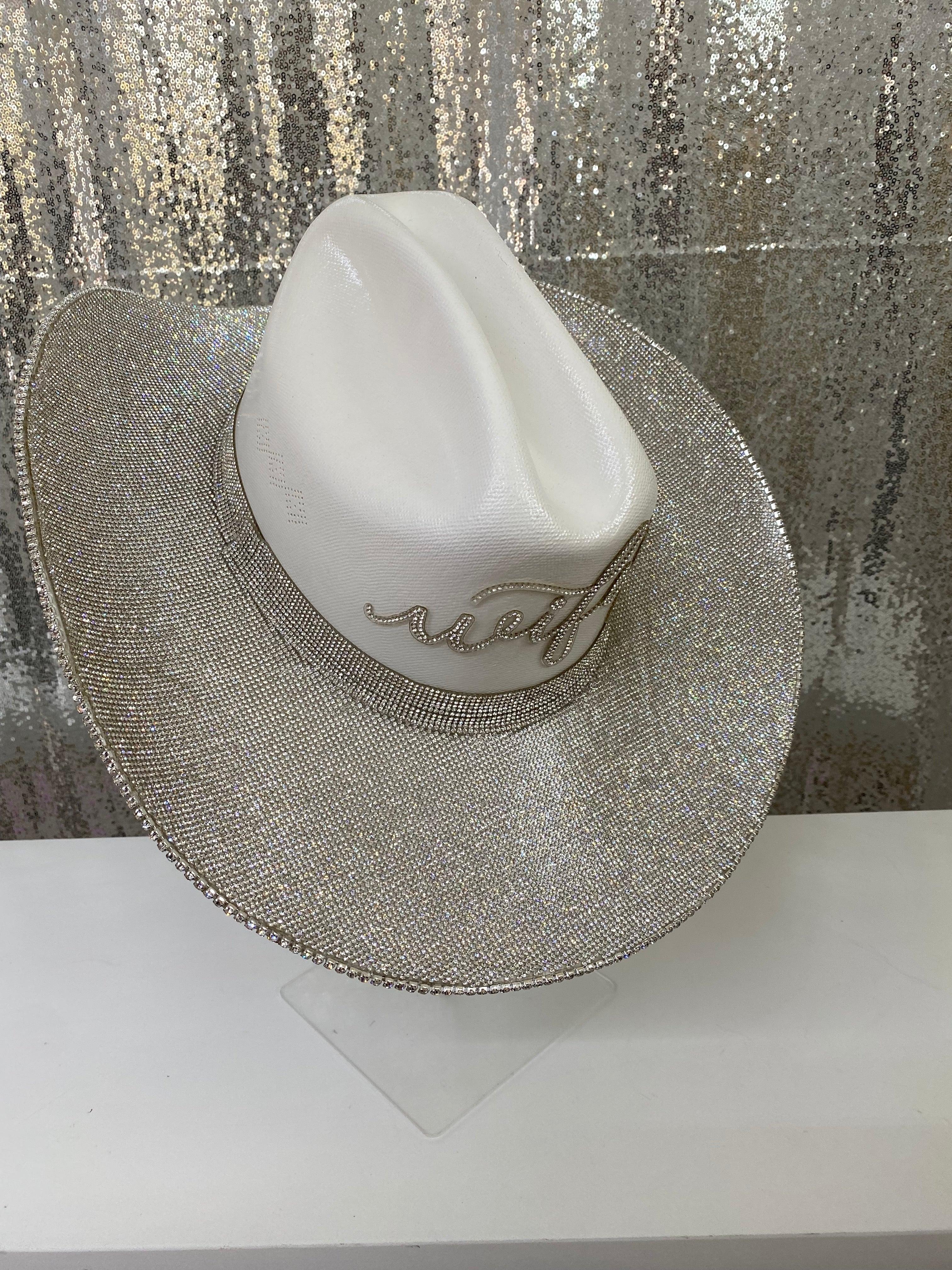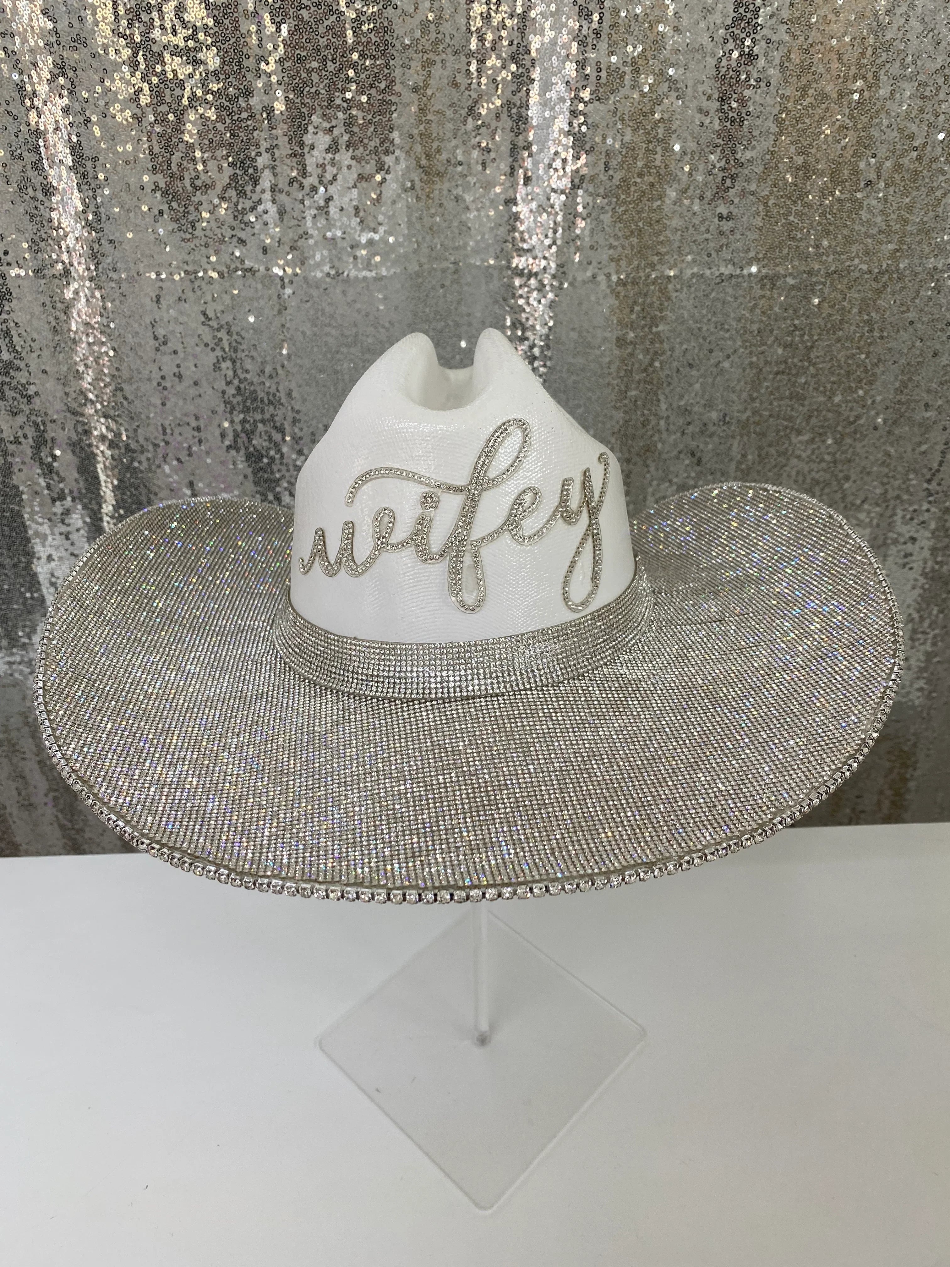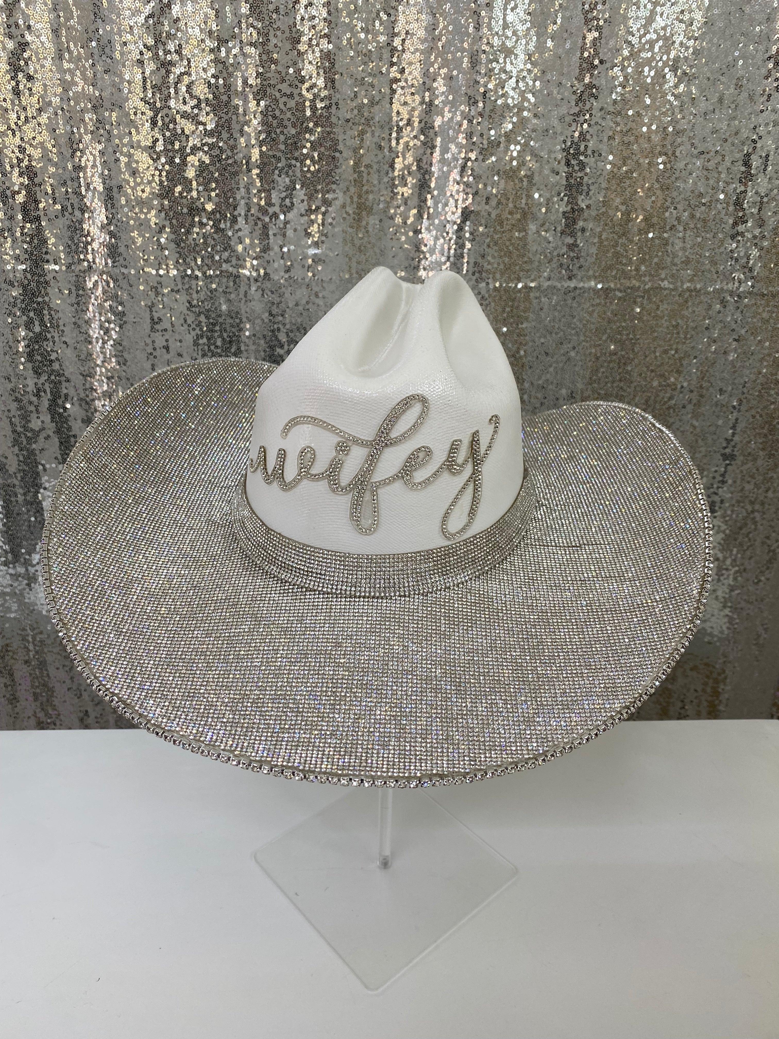 • Both brims rhinestoned has both brims (top and bottom) rhinestoned in crystal rhinestones with a matching crystal rhinestone hat band and the wifey applique