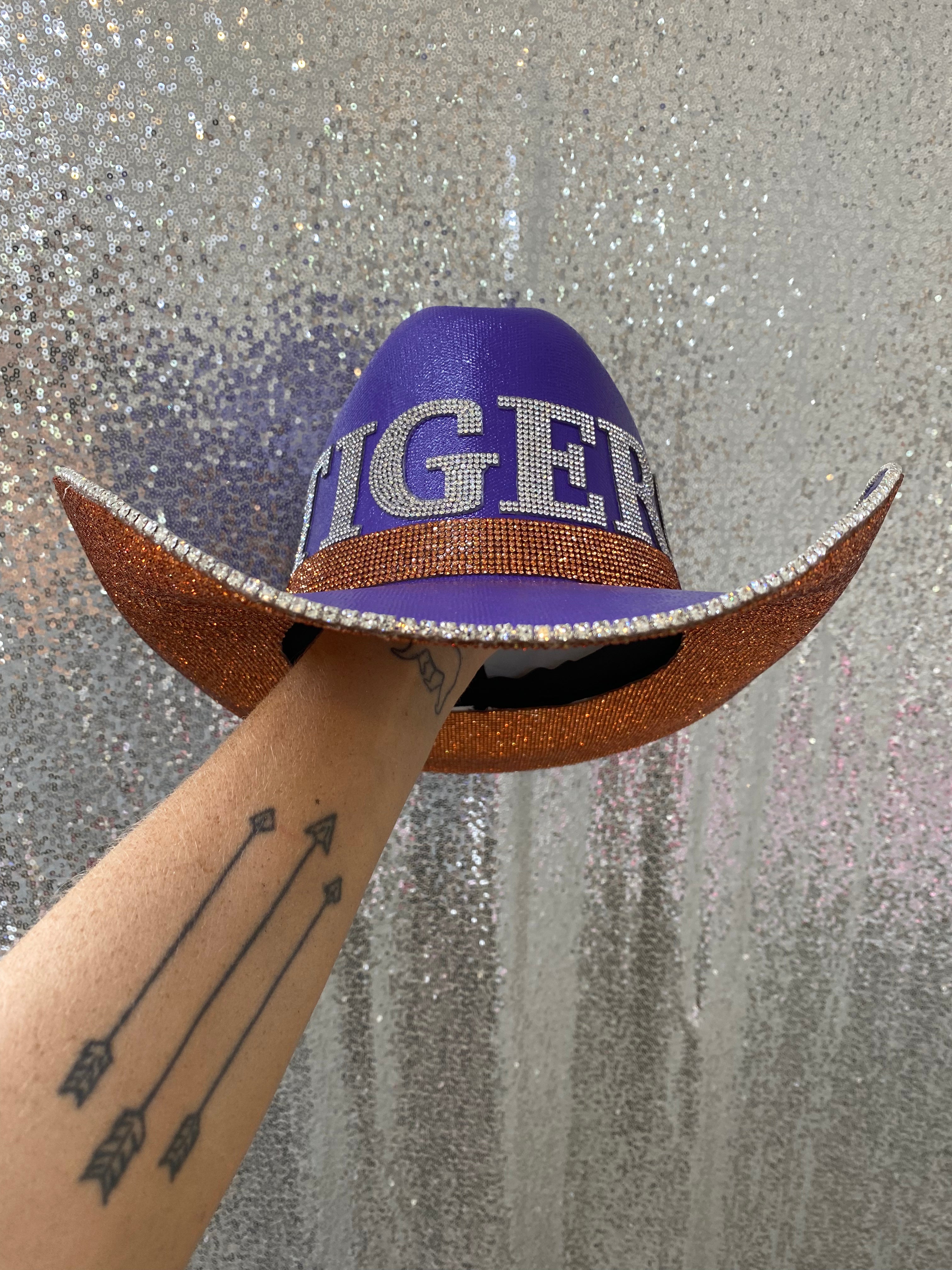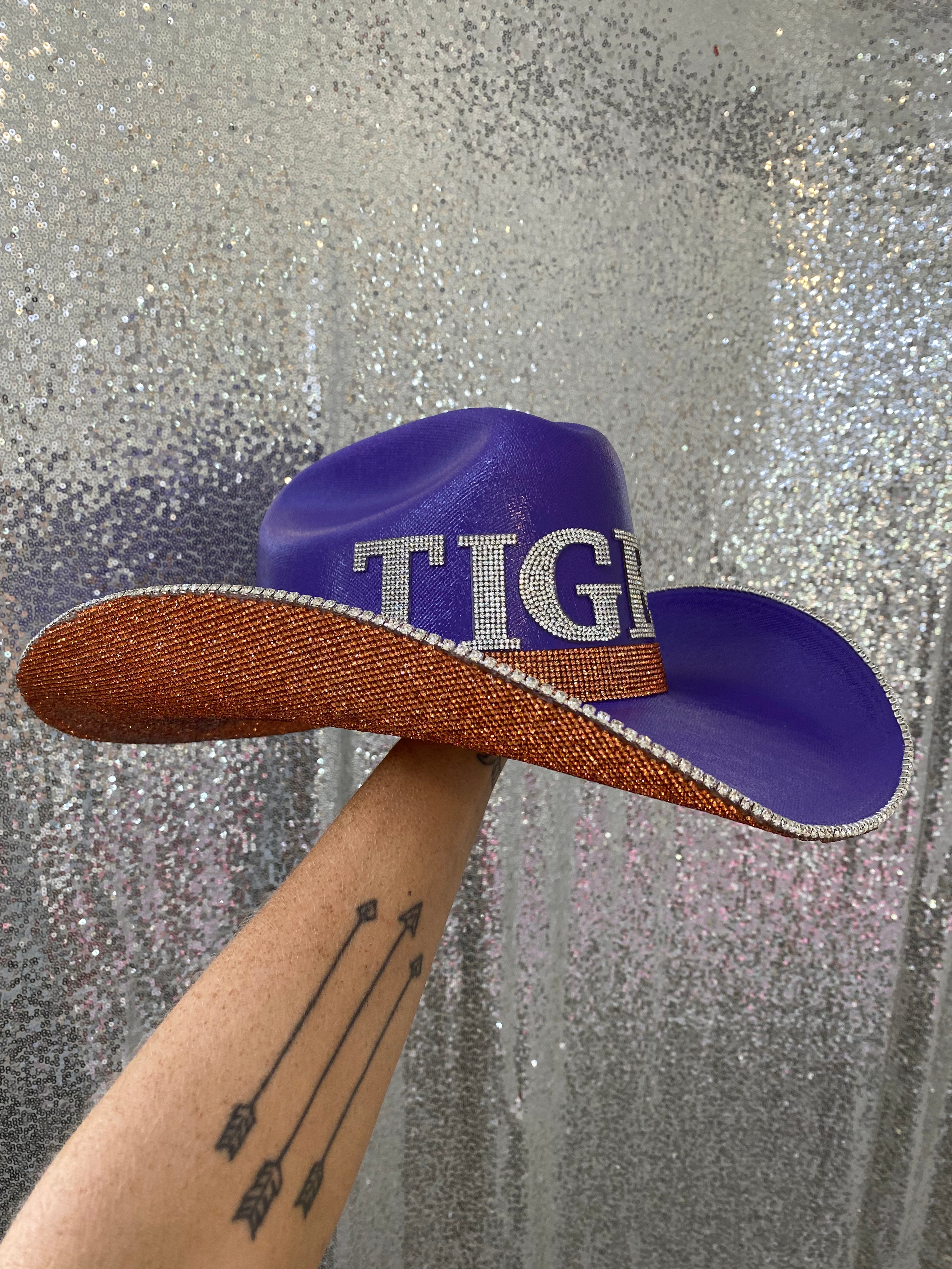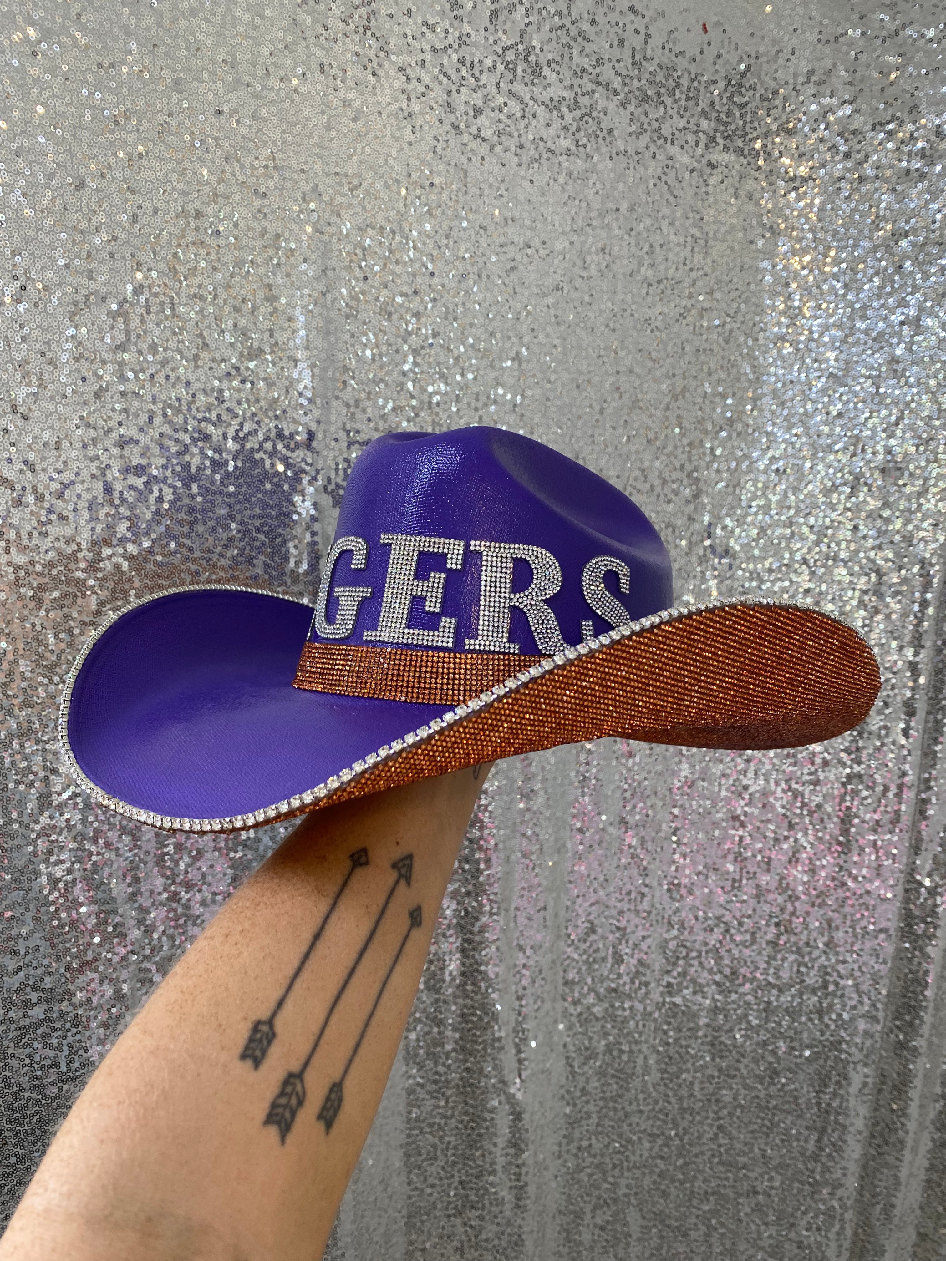 • TIGERS in crystal letters on the front of the hat