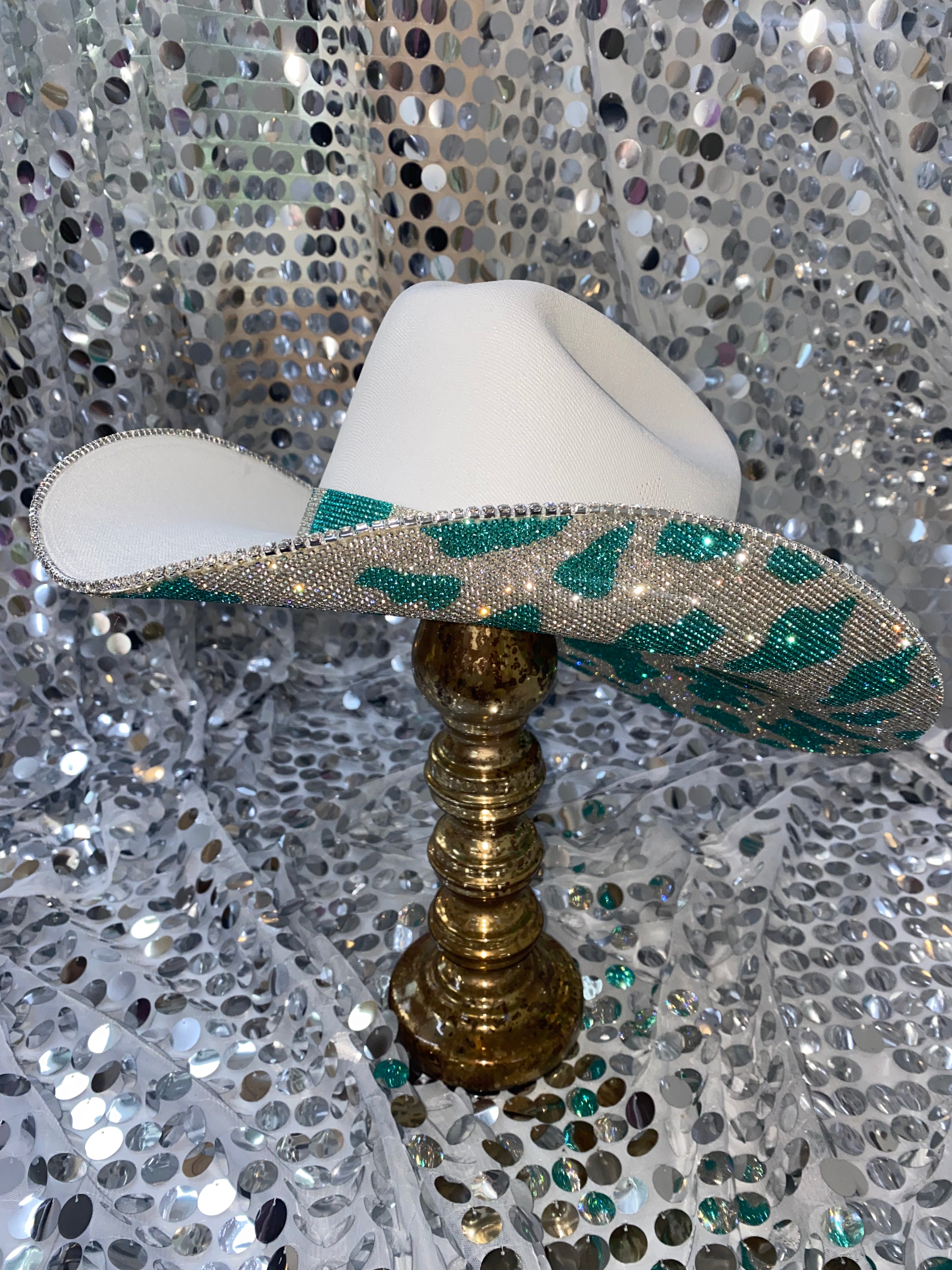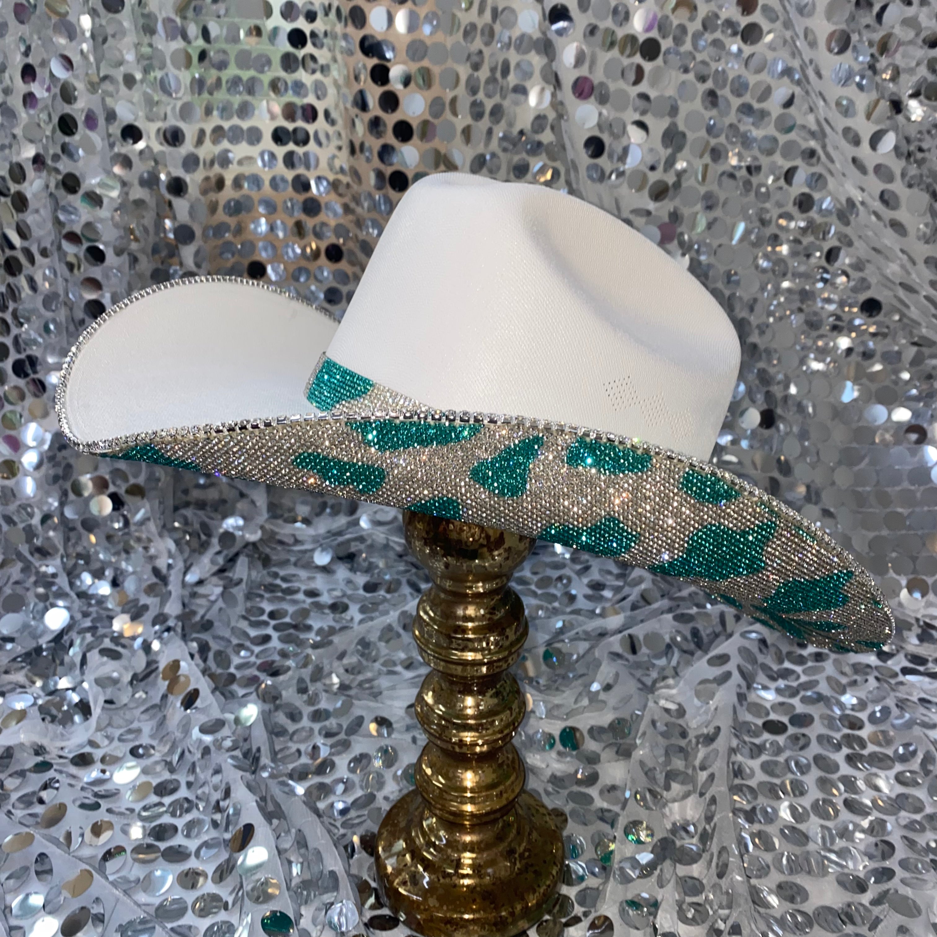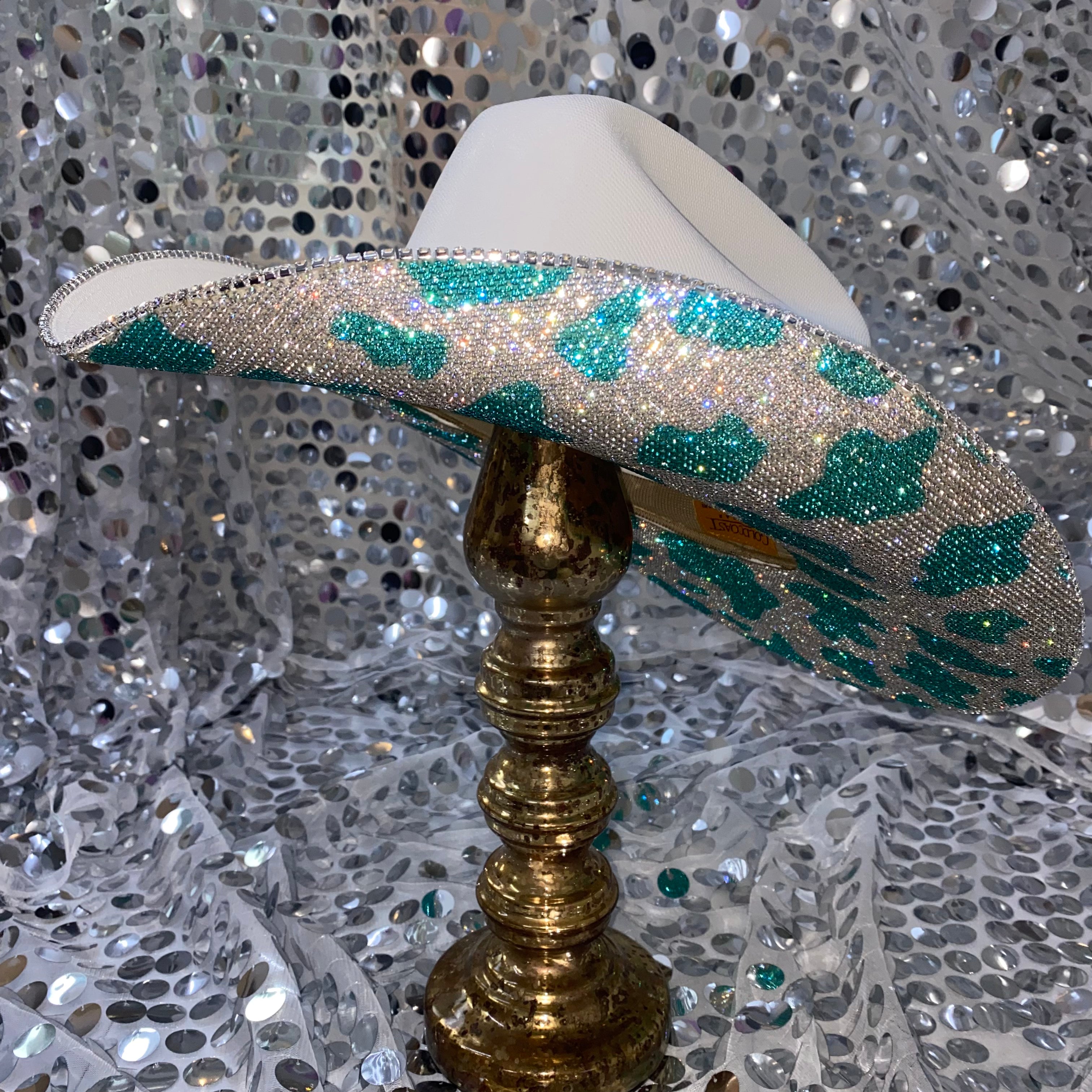 Our cow print hat features our white hat+ turquoise and crystal cow print rhinestones. This cow print hat goes so well with denim, white, fringe jackets and rhinestone dresses for a night out on the town.