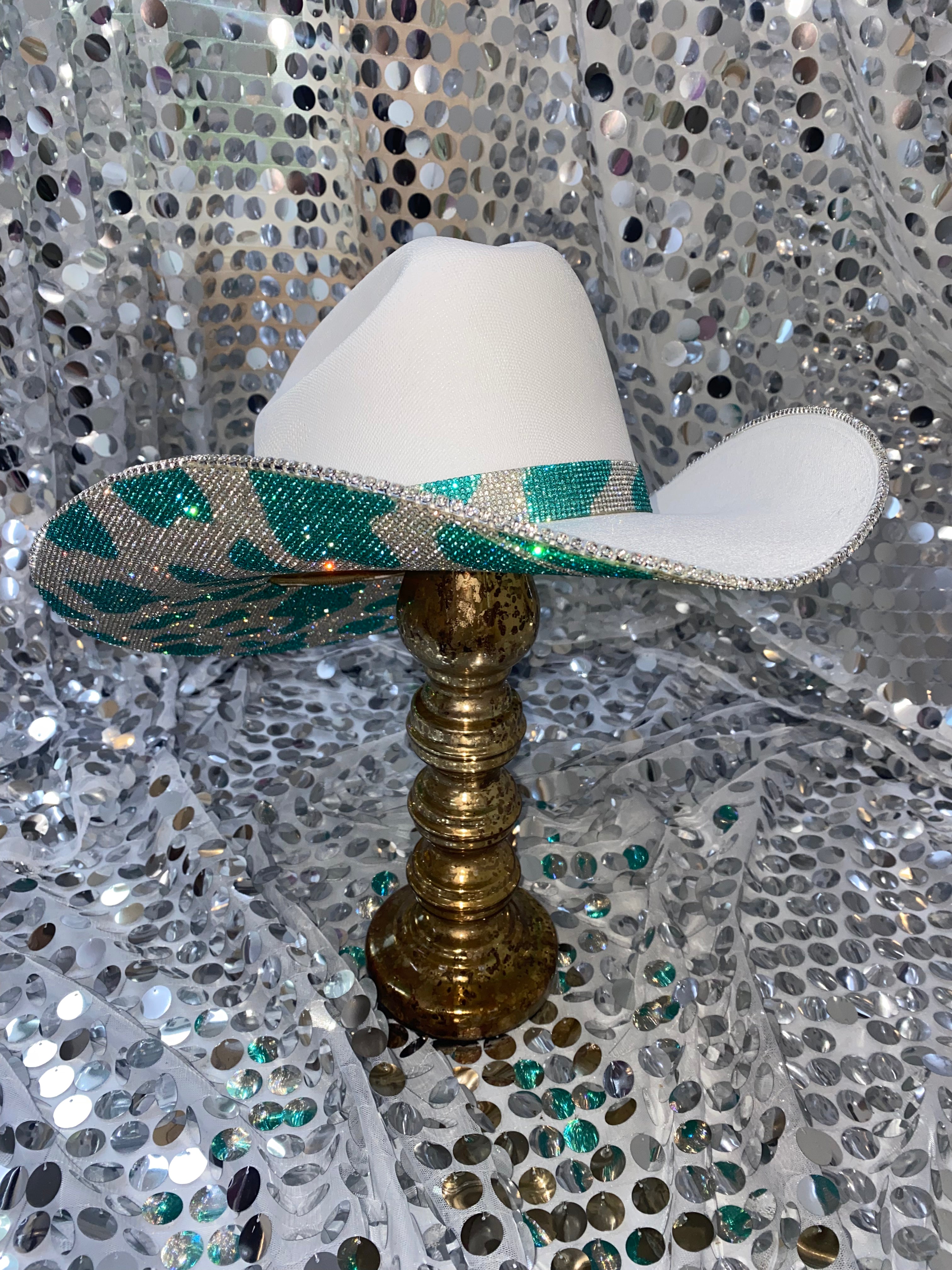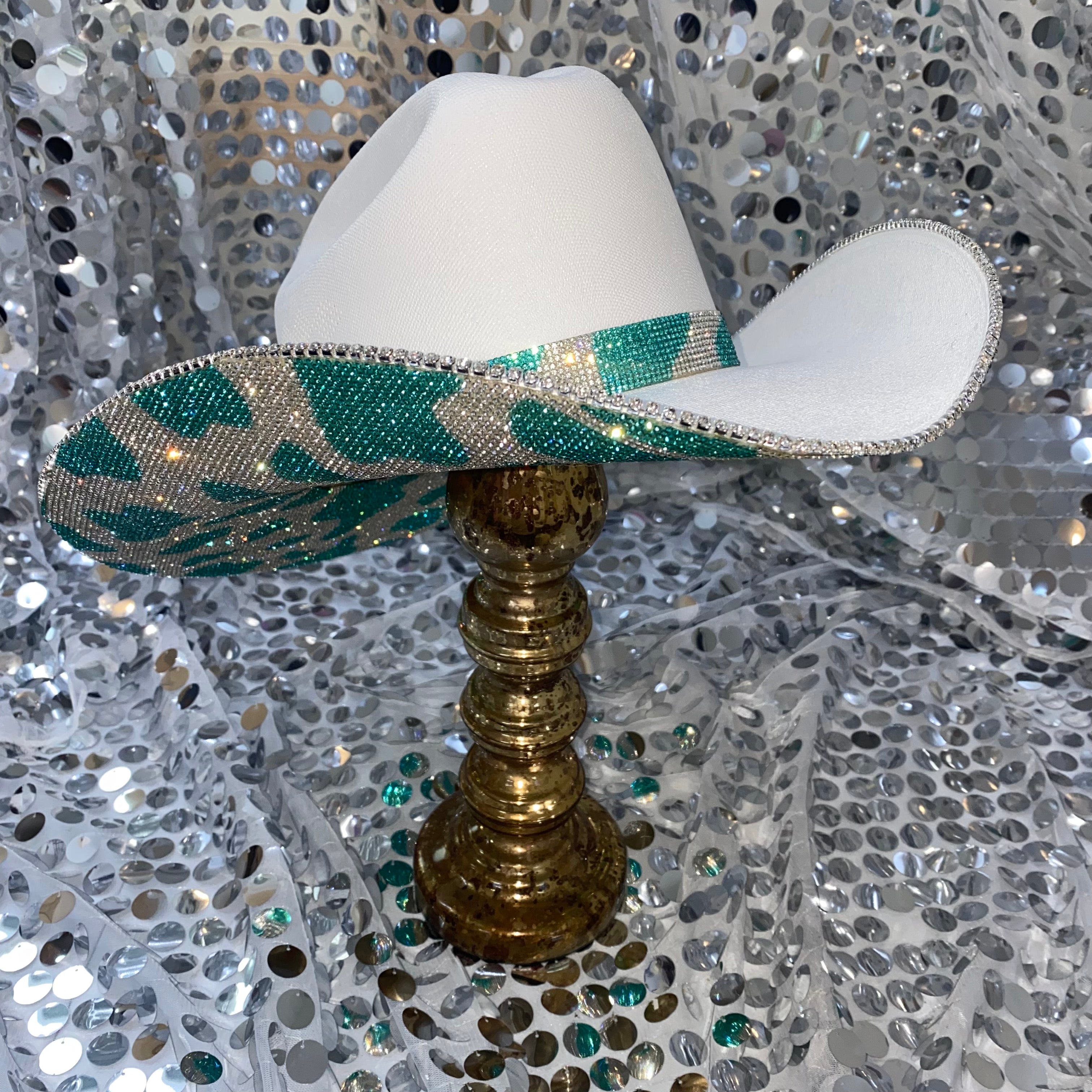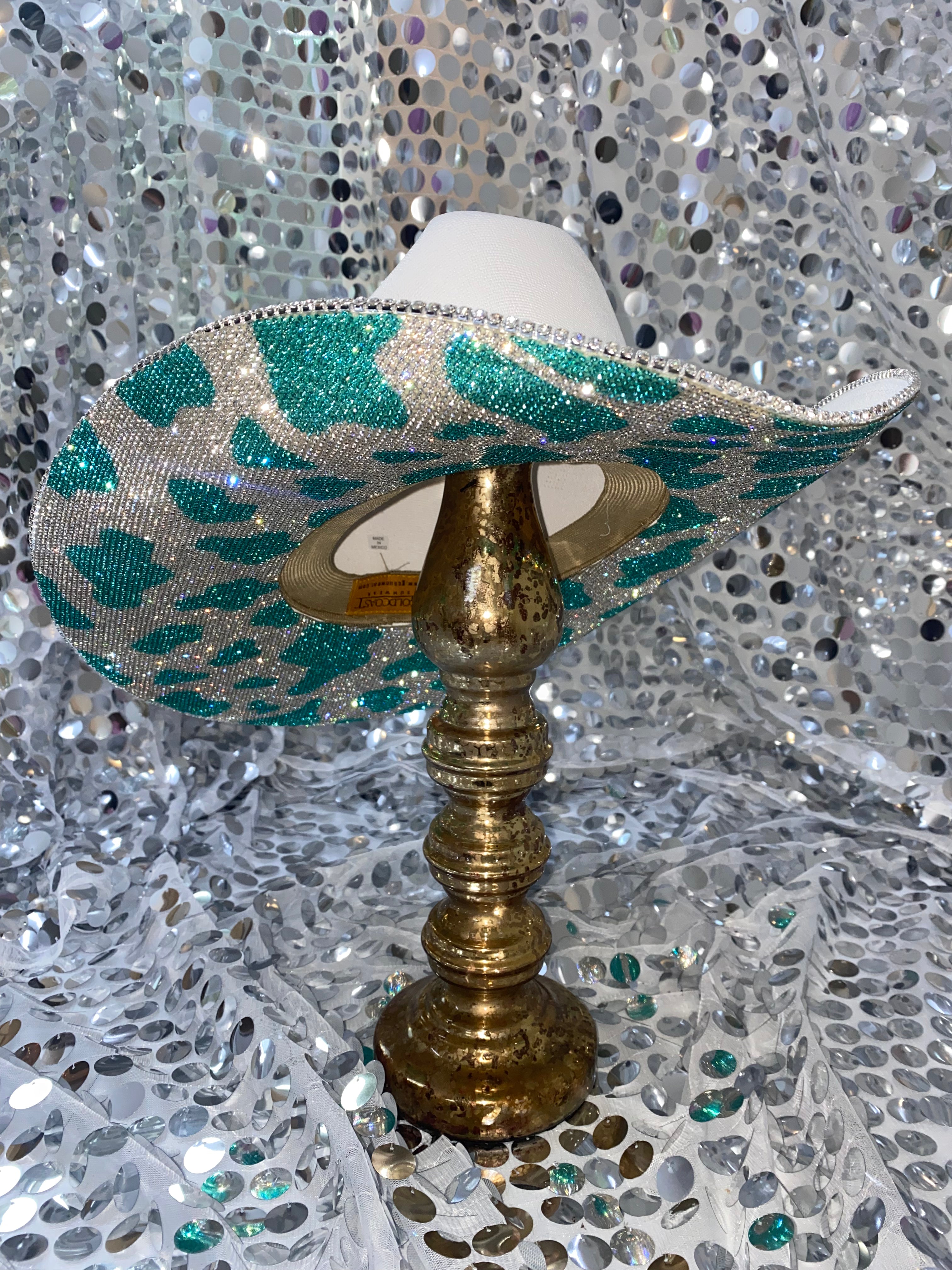 Our cow print hat features our white hat+ turquoise and crystal cow print rhinestones. This cow print hat goes so well with denim, white, fringe jackets and rhinestone dresses for a night out on the town.