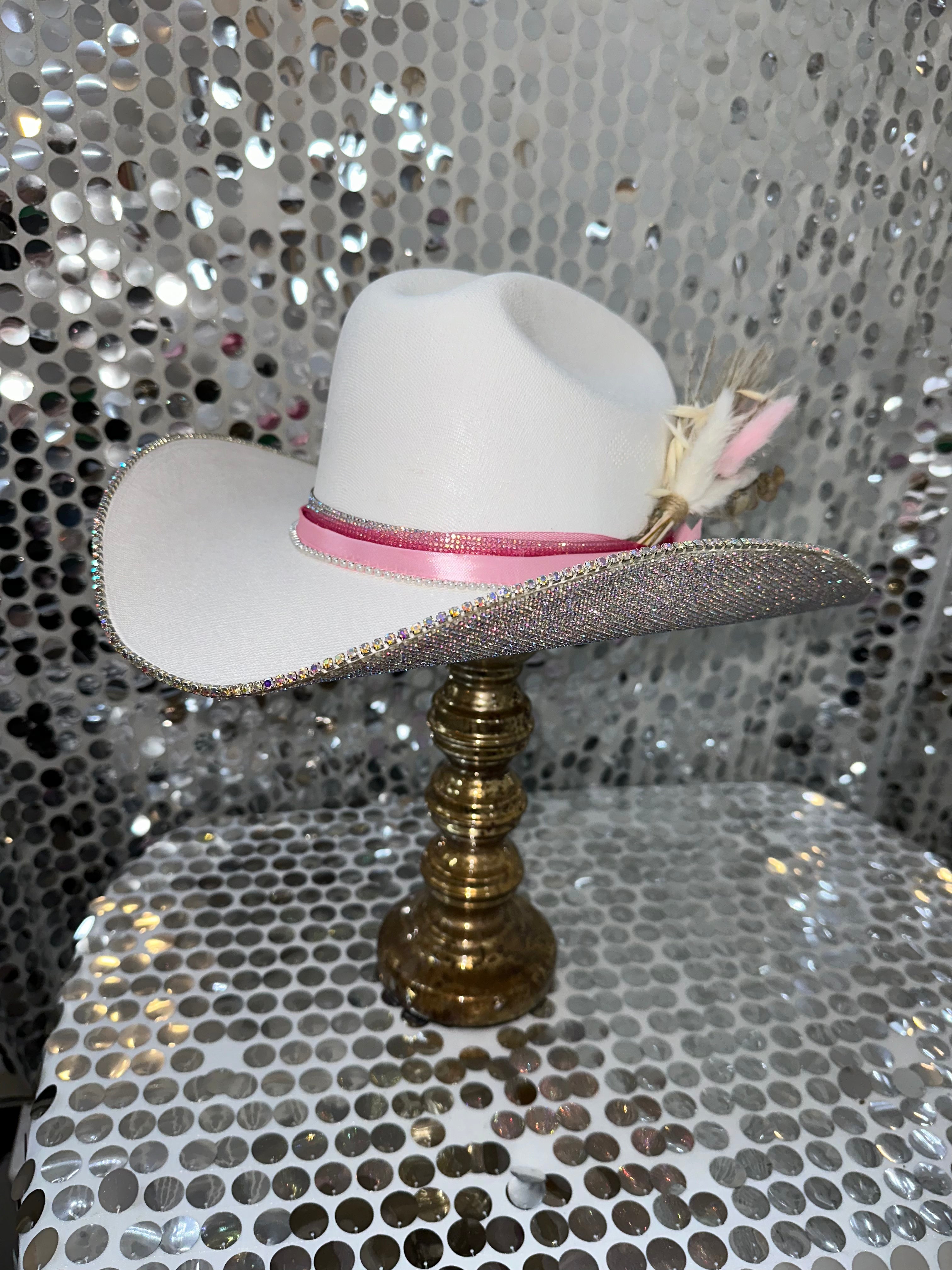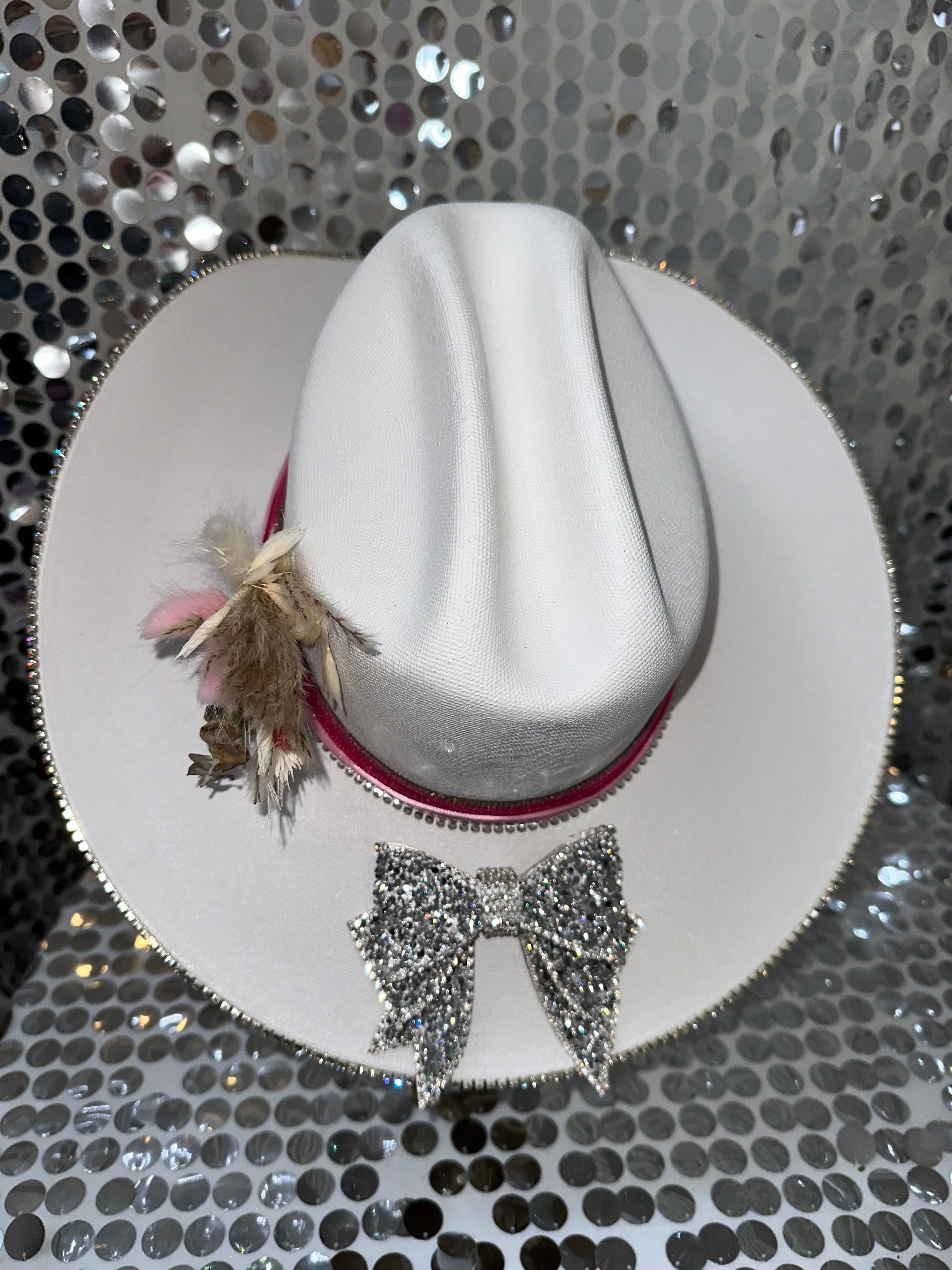 This white hat features pink tulle, ribbon and pearls around the band with a dried pink flower bouquet on the side and a rhinestone bow in the back. The perfect mix of boho chic + rhinestones.