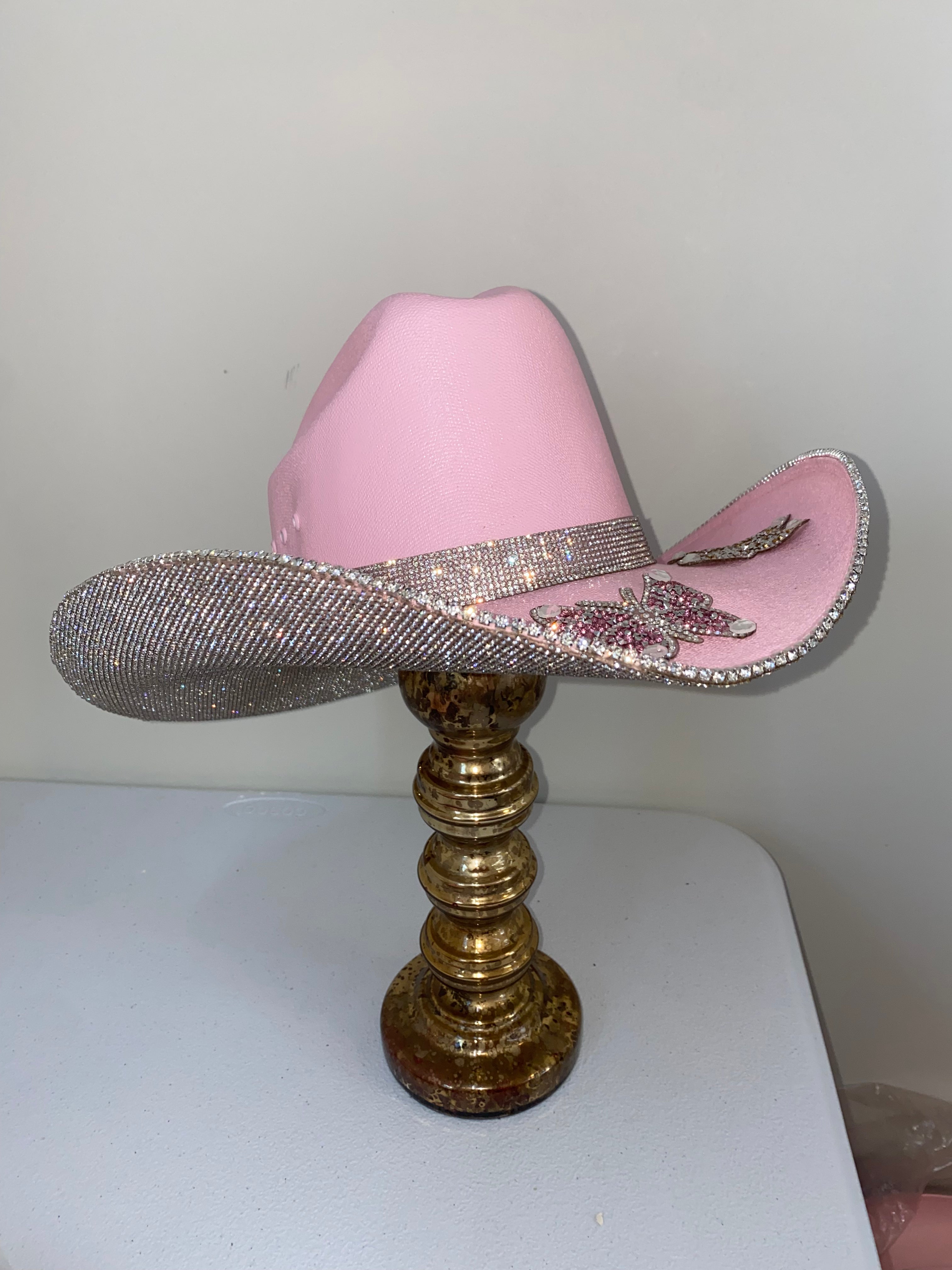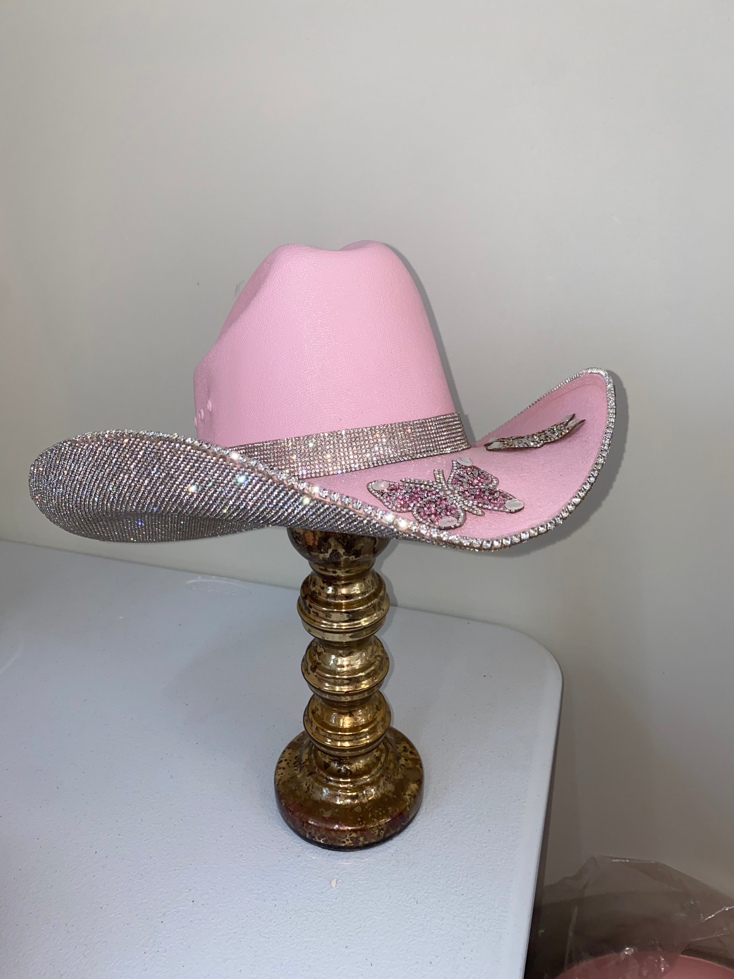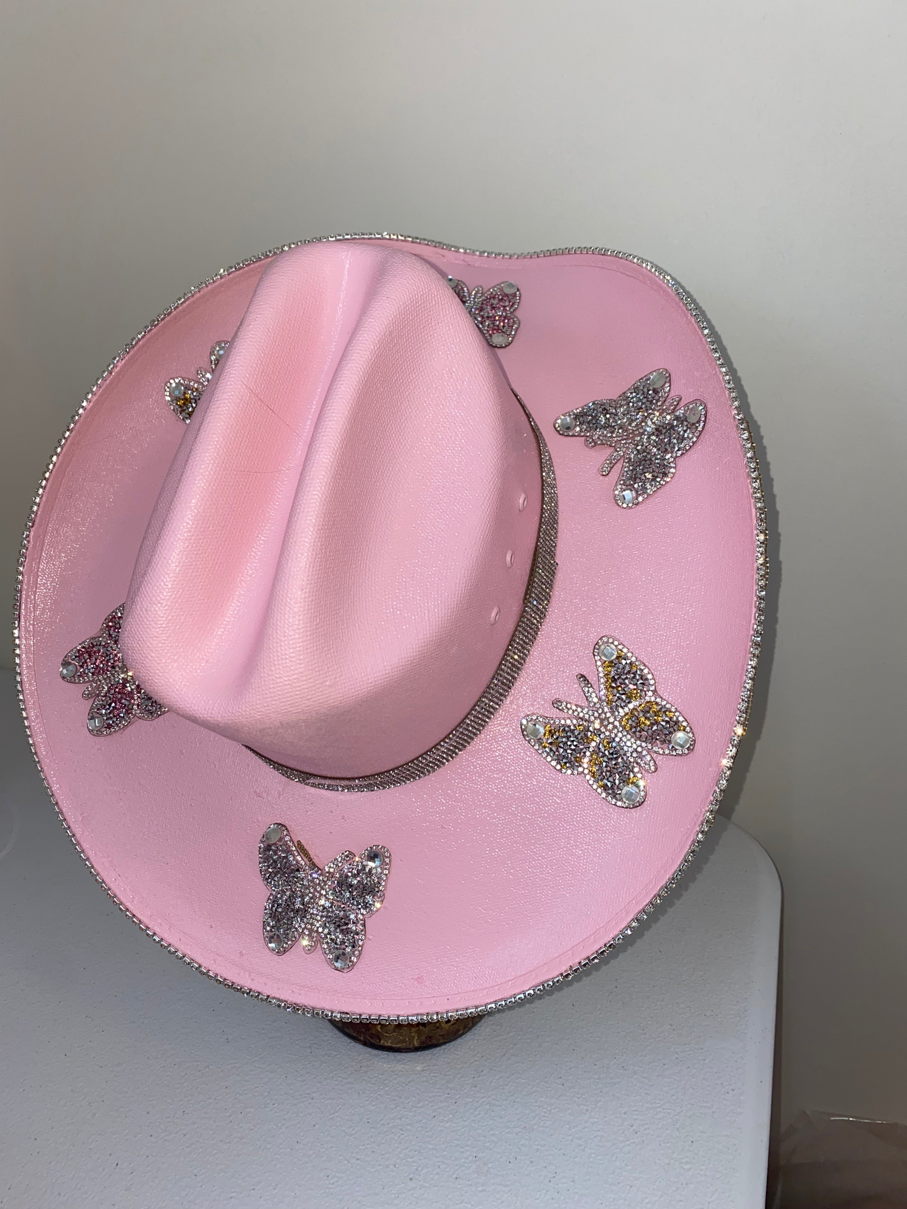 Inspired by Taylor Swift's Eras Tour, we custom made a pink hat with crystal rhinestones and six multi colored rhinestone butterflies on the top brim. Talk about perfection!