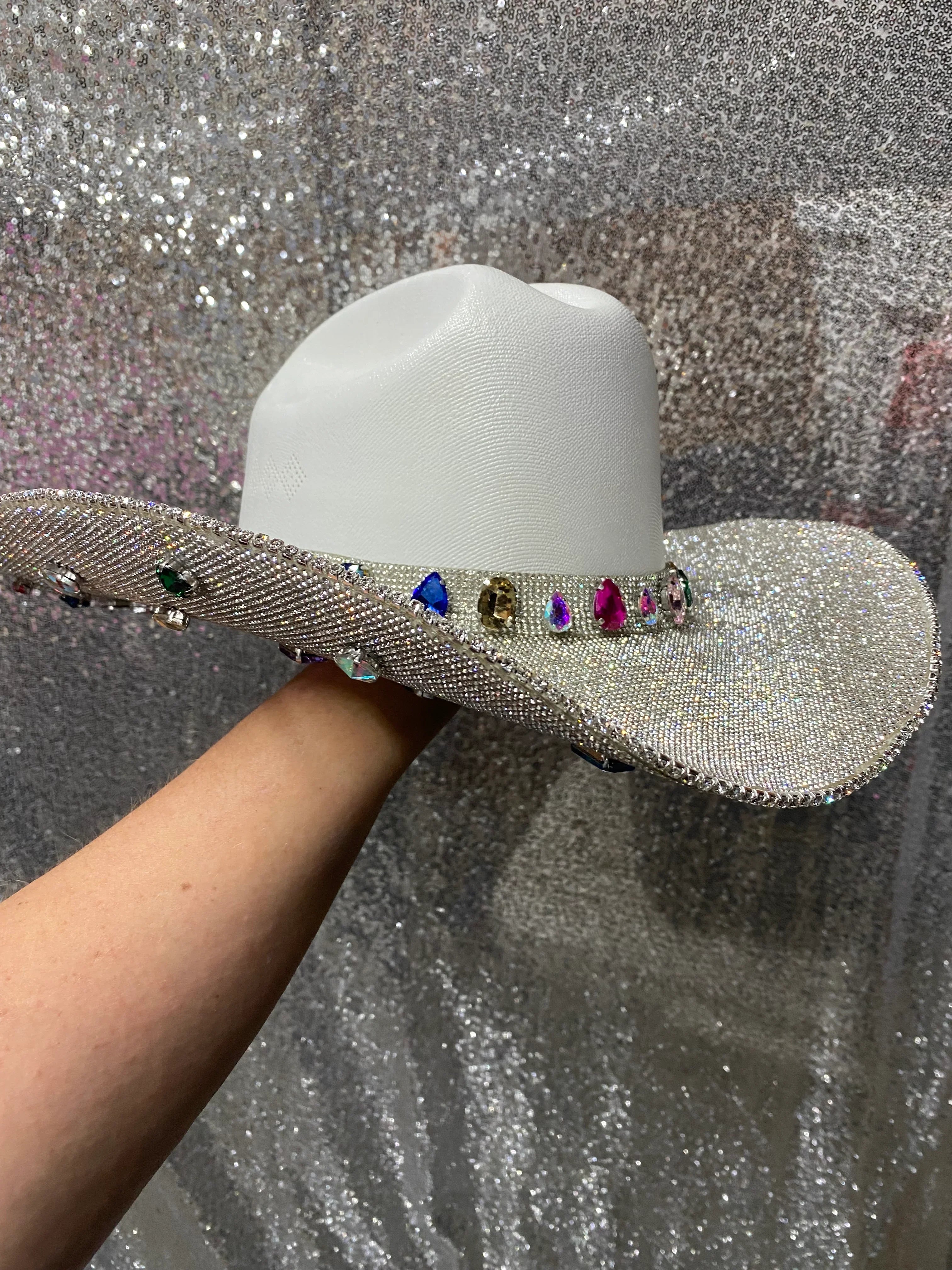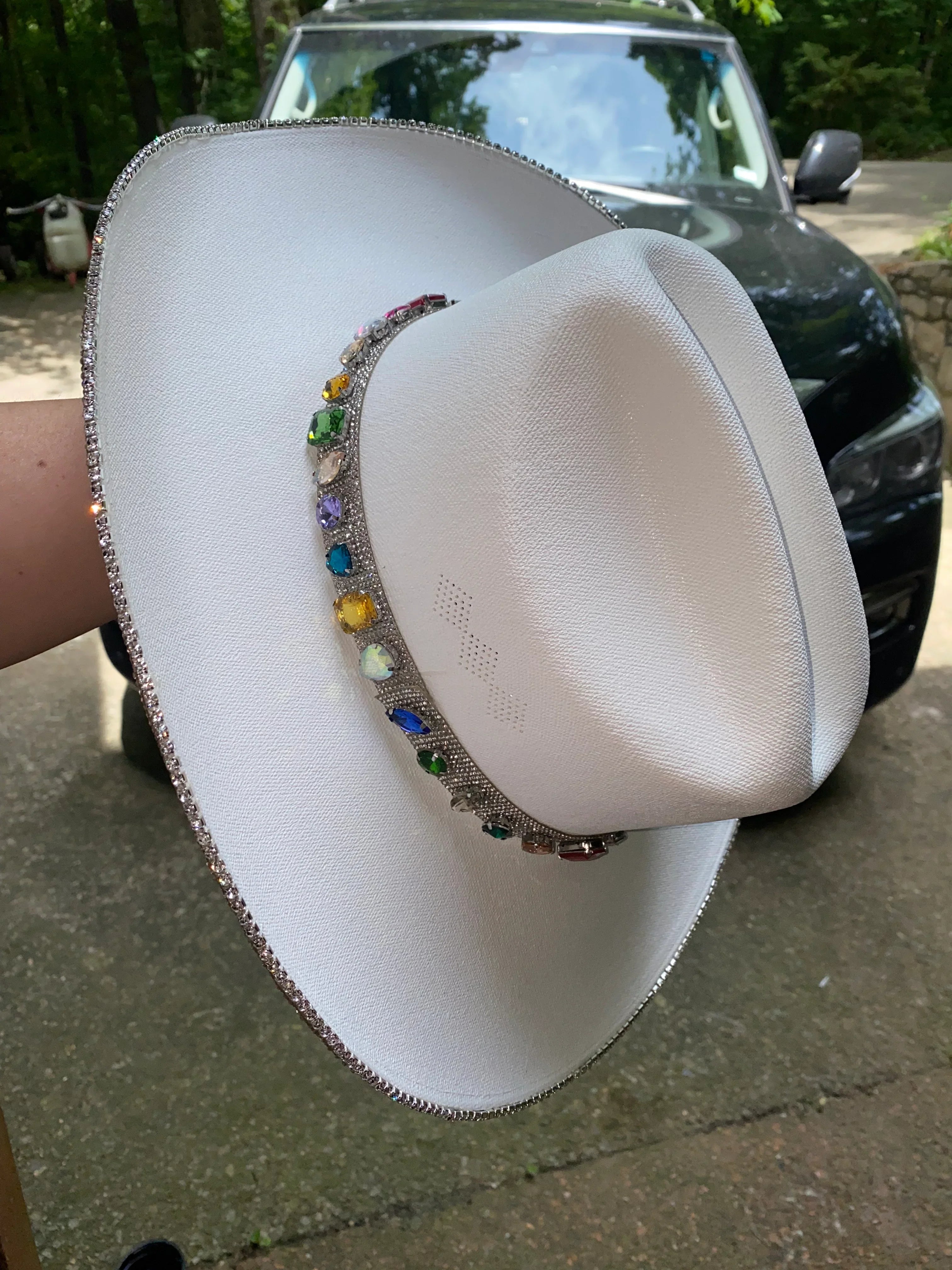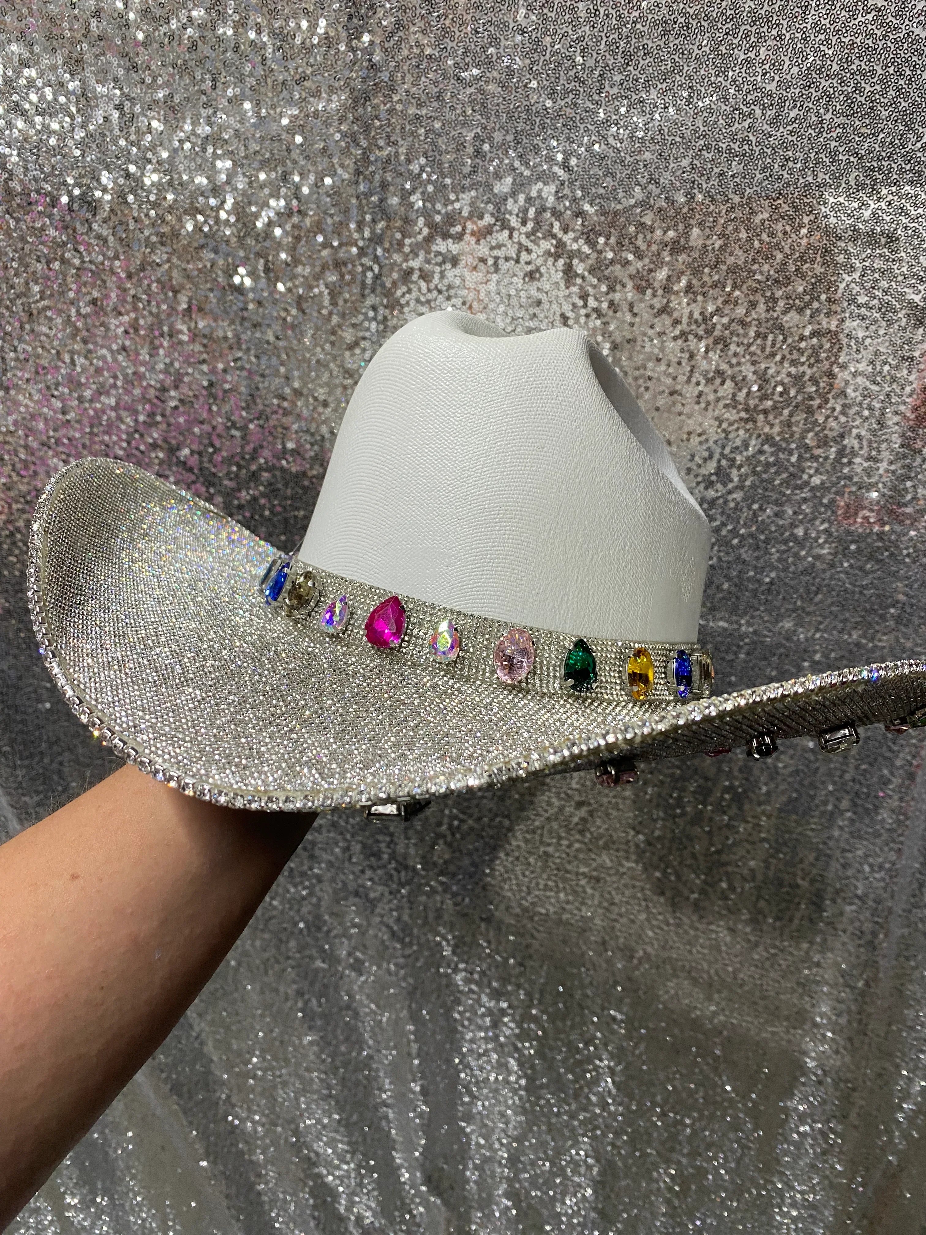 The “Rife” is named after blogger and influencer Whitney Rife (Instagram @Whitneyrife) who designed this white hat with crystal rhinestones and colorful gems. Nearly 60 gems are added to this hat all over the bottom brim and around the hat band to create a truly unique hat that no one else will have.