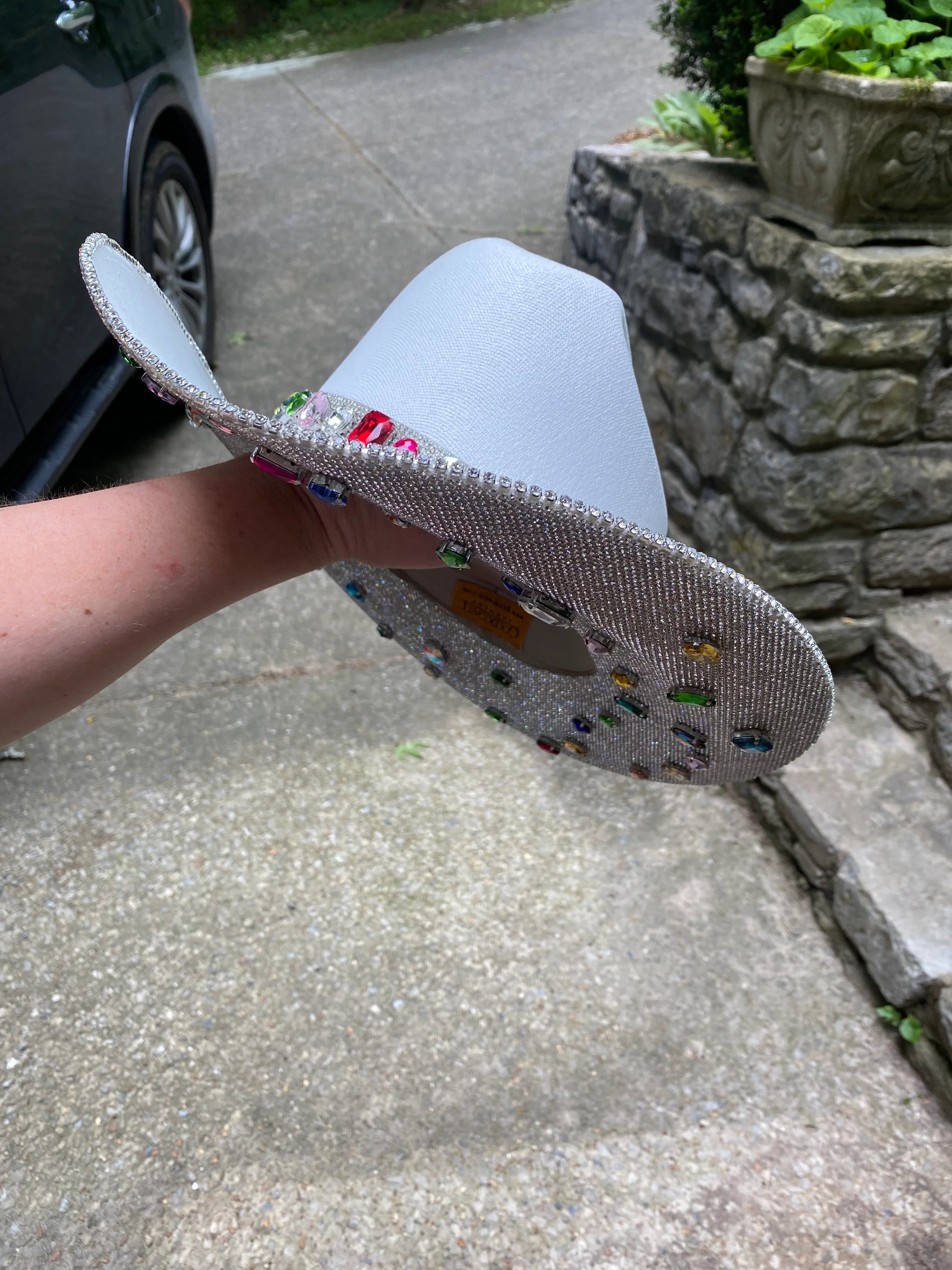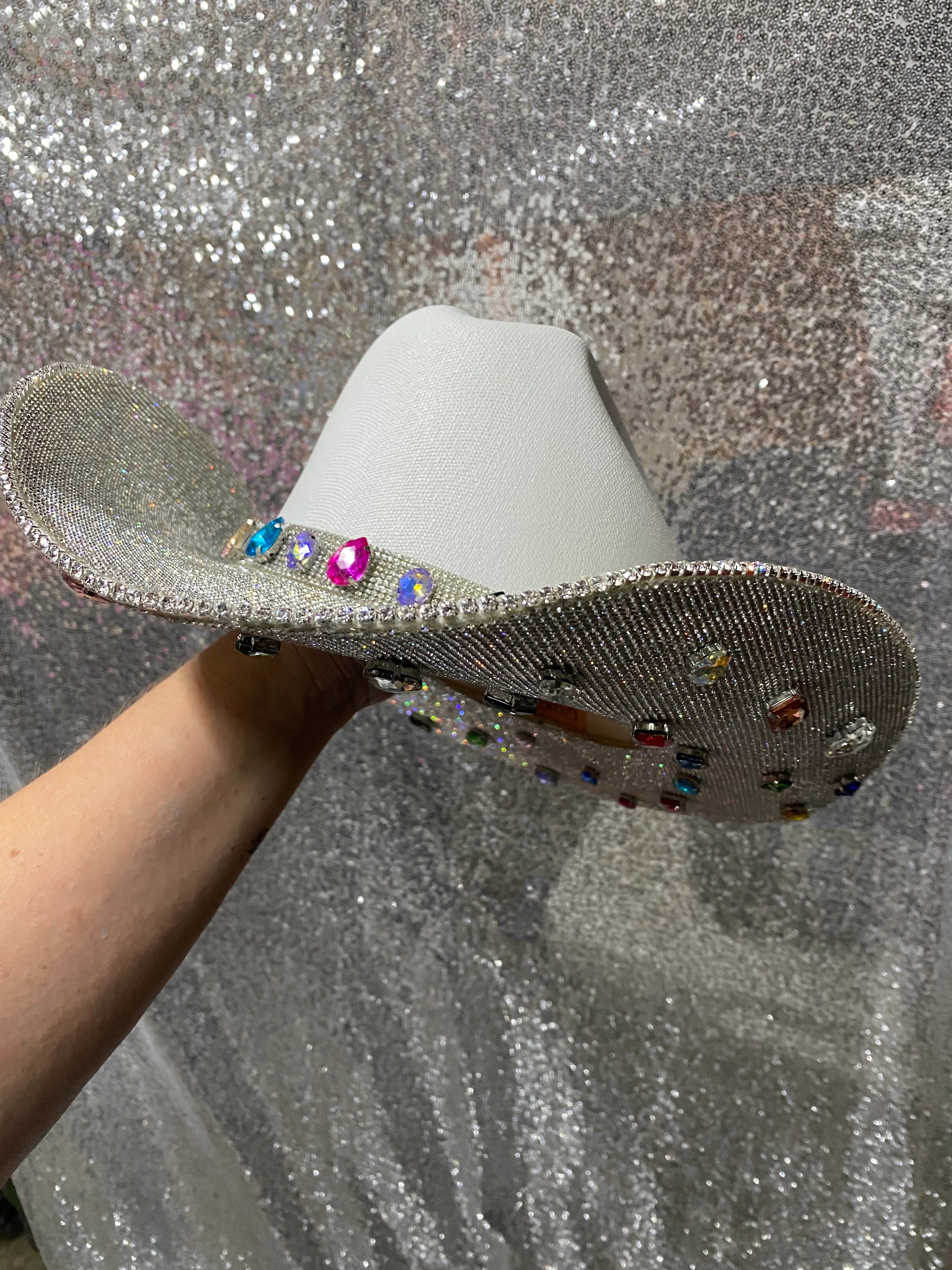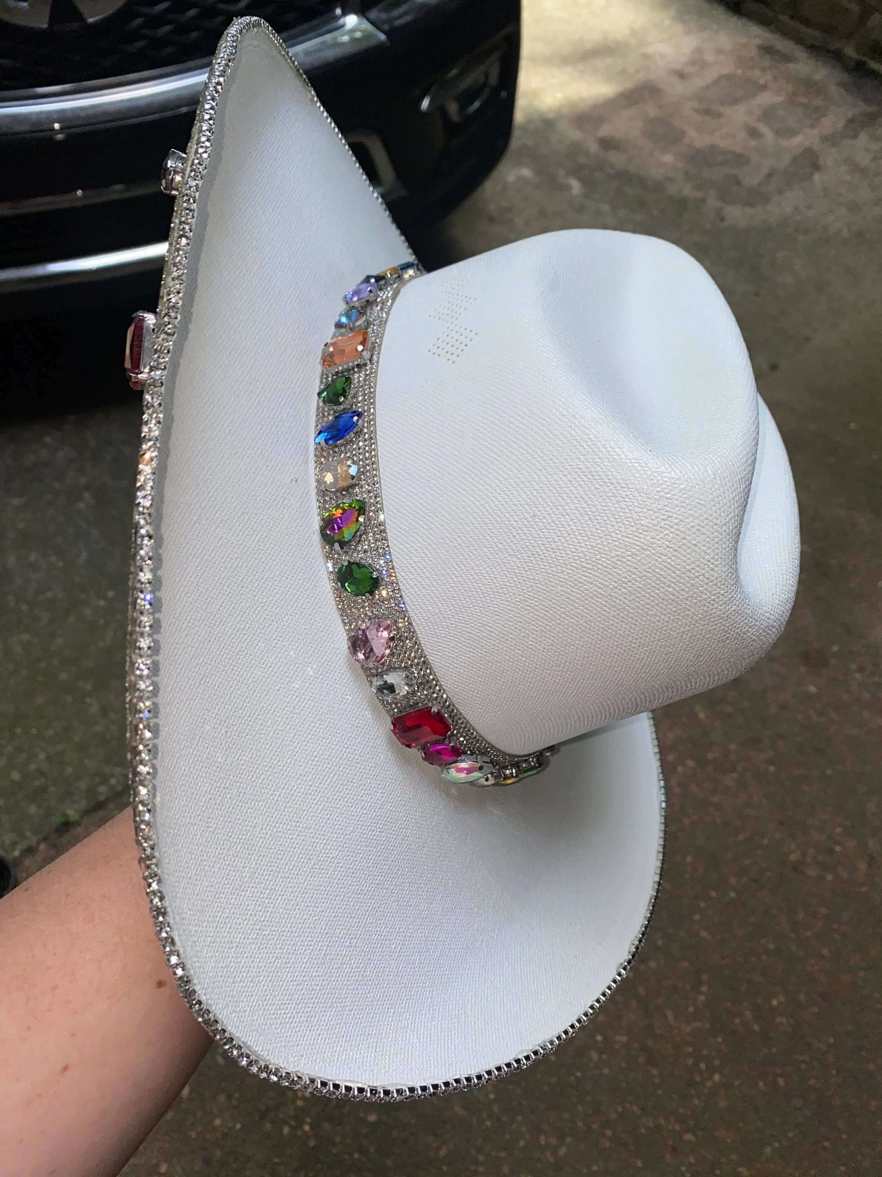 The “Rife” is named after blogger and influencer Whitney Rife (Instagram @Whitneyrife) who designed this white hat with crystal rhinestones and colorful gems. Nearly 60 gems are added to this hat all over the bottom brim and around the hat band to create a truly unique hat that no one else will have.