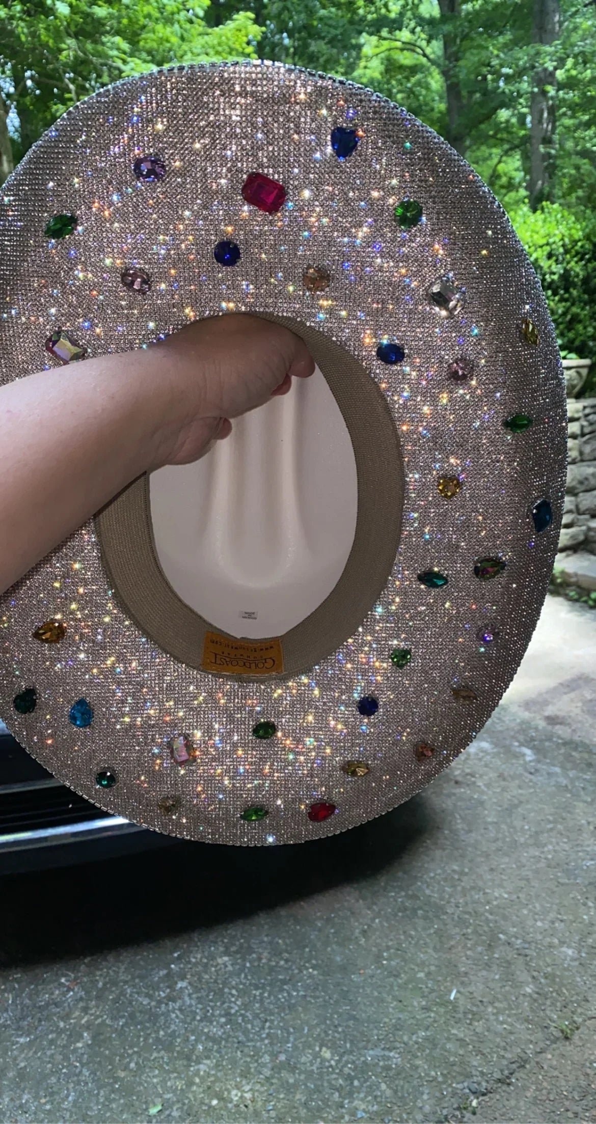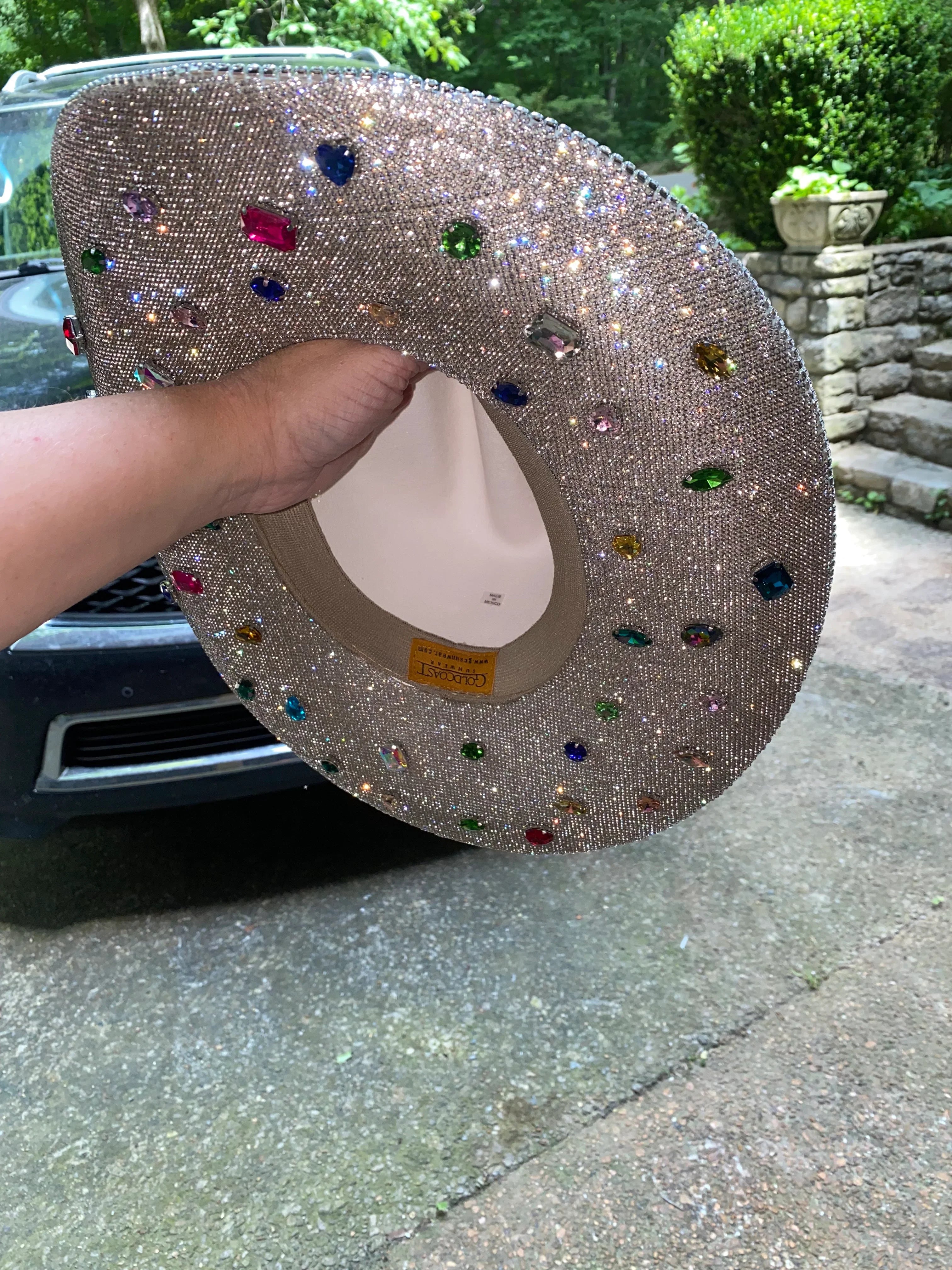 • Colorful gems placed all over the bottom brim + around the crystal hat ban
